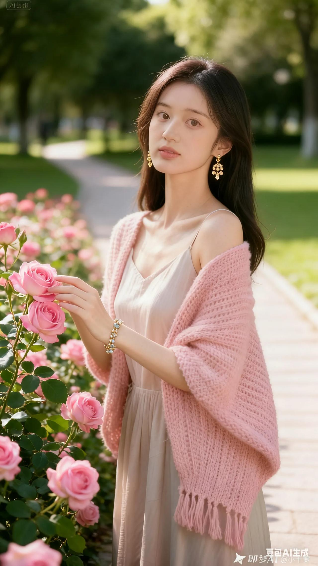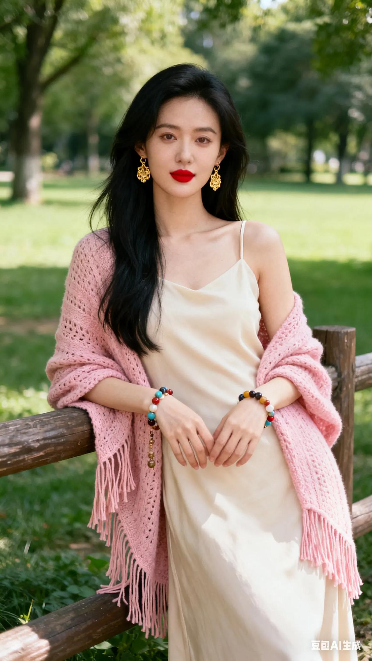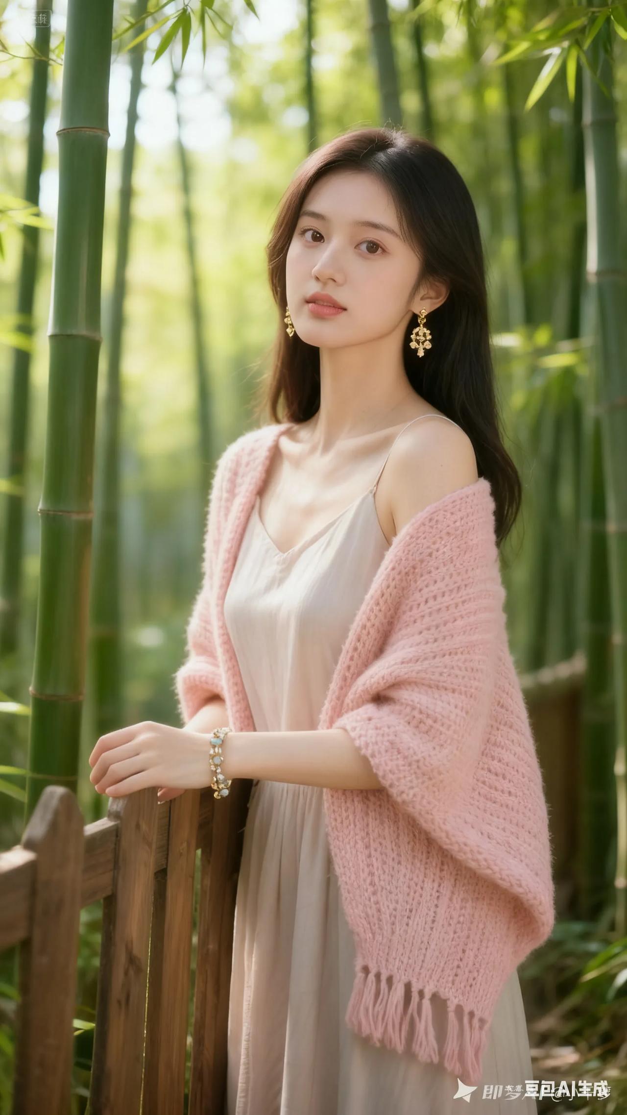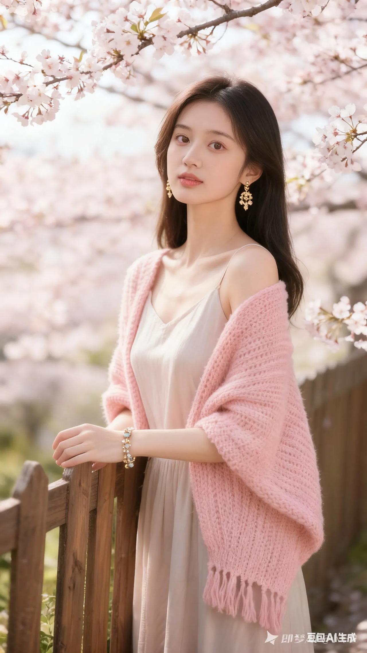 清新穿搭,粉色针织衫搭配米色连衣裙,尽显优雅与自然。