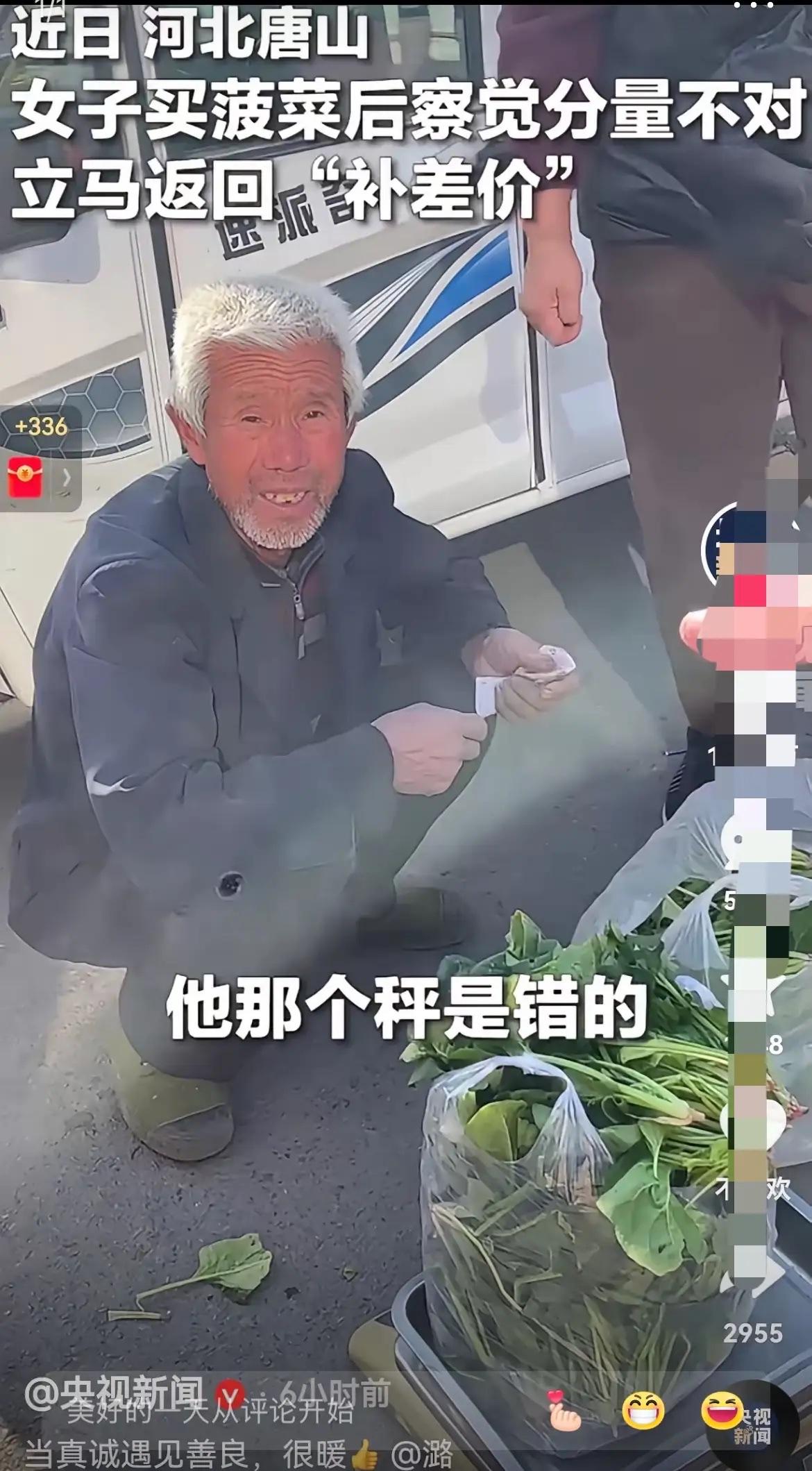 女子怕良心不安! 近日,河北唐山的邵女子在一老爷爷的摊位上买了一斤菠菜,当老爷爷称完菜之后,就觉得不太对劲,一斤的菠菜怎么这么多呢? 抱着怀疑的态度,邵女士带着菠菜回了家,等她回家用自家的称称了称。果不其然,这哪里是一斤的菠菜,分明就是两斤。 邵女士看着秤上的数字,心里咯噔一下!不是捡了便宜的窃喜,反倒是堵得慌。她跟身边人念叨,那老爷爷看着得有七十多岁,双手粗糙得像老树皮,指甲缝里还嵌着泥土,摊位就一块破旧的塑料布,摆着几捆青菜,看着就不容易。“人家挣点钱多难啊,说不定这一把菠菜,是他早上天不亮就去地里割的,多给一斤,他得少赚多少钱!” 她越想越坐不住,换了鞋就往菜市场跑。去的时候,老爷爷还坐在小马扎上,缩着脖子搓手,面前的青菜没卖出去多少。邵女士把菠菜往摊位上一放,直截了当跟老人说:“大爷,您刚才给我称的菠菜,我回家称了,足足两斤,您多给了我一斤!” 老人愣了一下,眯着眼睛看了看菠菜,又摸了摸自己的旧秤,不好意思地笑了:“姑娘,实在对不住,我这眼睛花了,称的时候没看清刻度,让你跑一趟。”说着就想把多的一斤菠菜拿出来,邵女士连忙拦住:“大爷,菜我不往回拿了,我给您补一斤的钱,您这么大年纪摆摊不容易,可不能让您吃亏。” 周围买菜的人都围了过来,有人夸邵女士实在,也有人说:“现在还有这么傻的人,多给了还送回来,换别人早就偷着乐了。”邵女士听见了,笑着说:“不是傻,是良心上过不去。我要是拿着这多出来的一斤菠菜,吃着也不香,夜里都睡不踏实。” 其实邵女士的日子也不算富裕,她自己也是普通上班族,平时买菜都要货比三家。但她知道,老人摆摊挣的都是辛苦钱,一分一厘都来之不易。反观现在有些商家,缺斤少两是常事,有的甚至故意用不准的秤,就为了多赚几块钱。可这位老爷爷,明明自己不容易,却因为疏忽多给了菜,这份淳朴和实在,比什么都珍贵。 后来有人把这件事发到了网上,很多网友都为邵女士点赞,还有人说:“这才是真正的善良,不是轰轰烈烈的大事,却是藏在细节里的温暖。”也有网友分享,自己遇到过类似的事,有一次买水果,摊主多找了二十块钱,自己当时没发现,回家后才看到,第二天特意绕路送了回去,摊主握着她的手说,那二十块钱是他一天的利润。 这件事看着小,却折射出了人与人之间最珍贵的诚信。现在社会发展快,很多人都忙着赚钱,忽略了做人的本分。有人觉得,占点小便宜没关系,可就是这些看似不起眼的小便宜,慢慢消耗着人与人之间的信任。而邵女士的做法,就像一束光,照亮了这份缺失的信任,也让我们看到,善良和诚信从来都没有过时。 还有那个摆摊的老爷爷,他没有因为自己年纪大就投机取巧,反而因为疏忽多给了菜,这份淳朴让人动容。现在很多年轻人都不愿意摆摊卖菜,觉得辛苦又不赚钱,可这些老人,靠着自己的双手,种点青菜,摆个小摊,挣点零花钱补贴家用,他们不坑人,不骗人,用最实在的方式谋生,值得我们每一个人尊重。 其实良心这东西,看不见摸不着,却能指引我们做正确的事。邵女士怕良心不安,选择把多给的菜钱补回去,她补的不仅仅是几块钱,更是对老人劳动的尊重,对诚信的坚守。而我们在生活中,也会遇到各种各样的选择,是占小便宜,还是坚守本心?邵女士已经给了我们答案。 希望这件事能让更多人明白,诚信不是一句口号,而是藏在每一个细微的选择里。多一份真诚,少一份算计;多一份善良,少一份自私,我们的社会才能更温暖,人与人之间的关系才能更融洽。 各位读者你们怎么看?欢迎在评论区讨论。