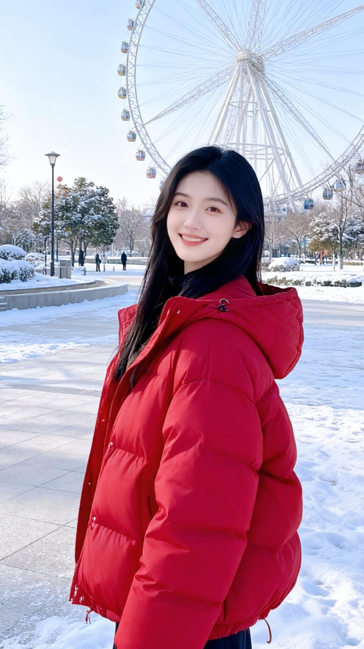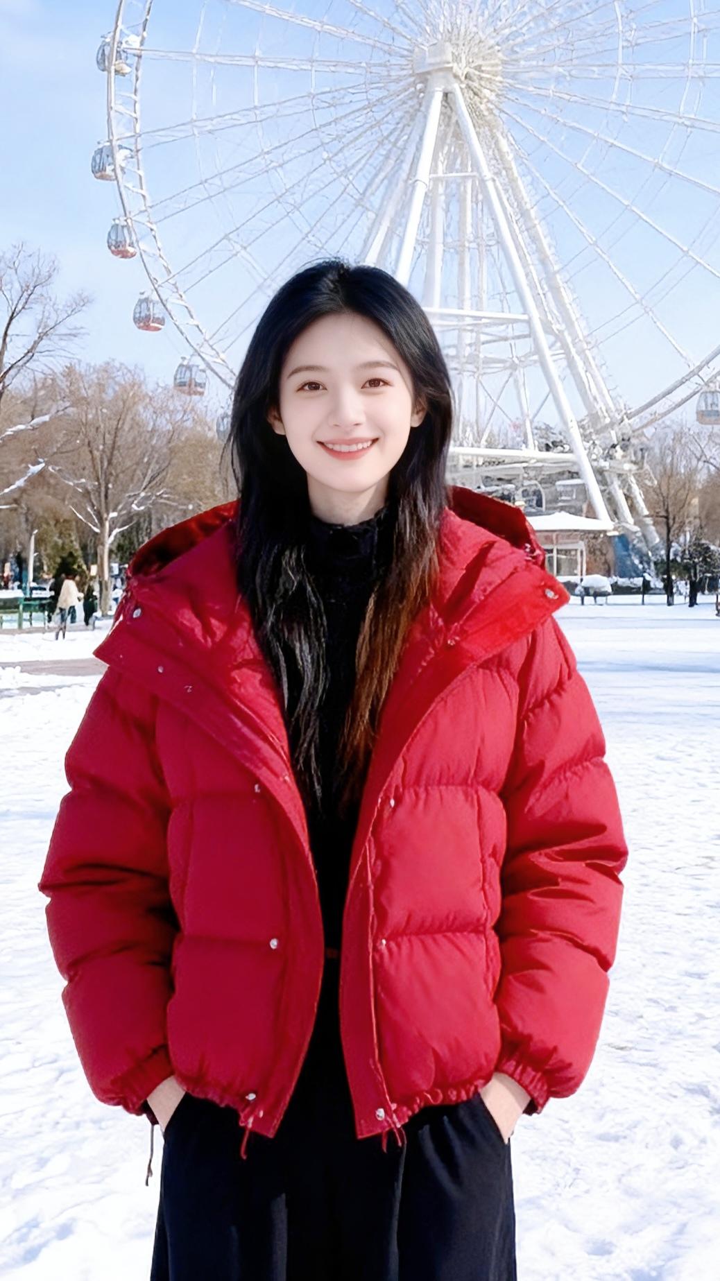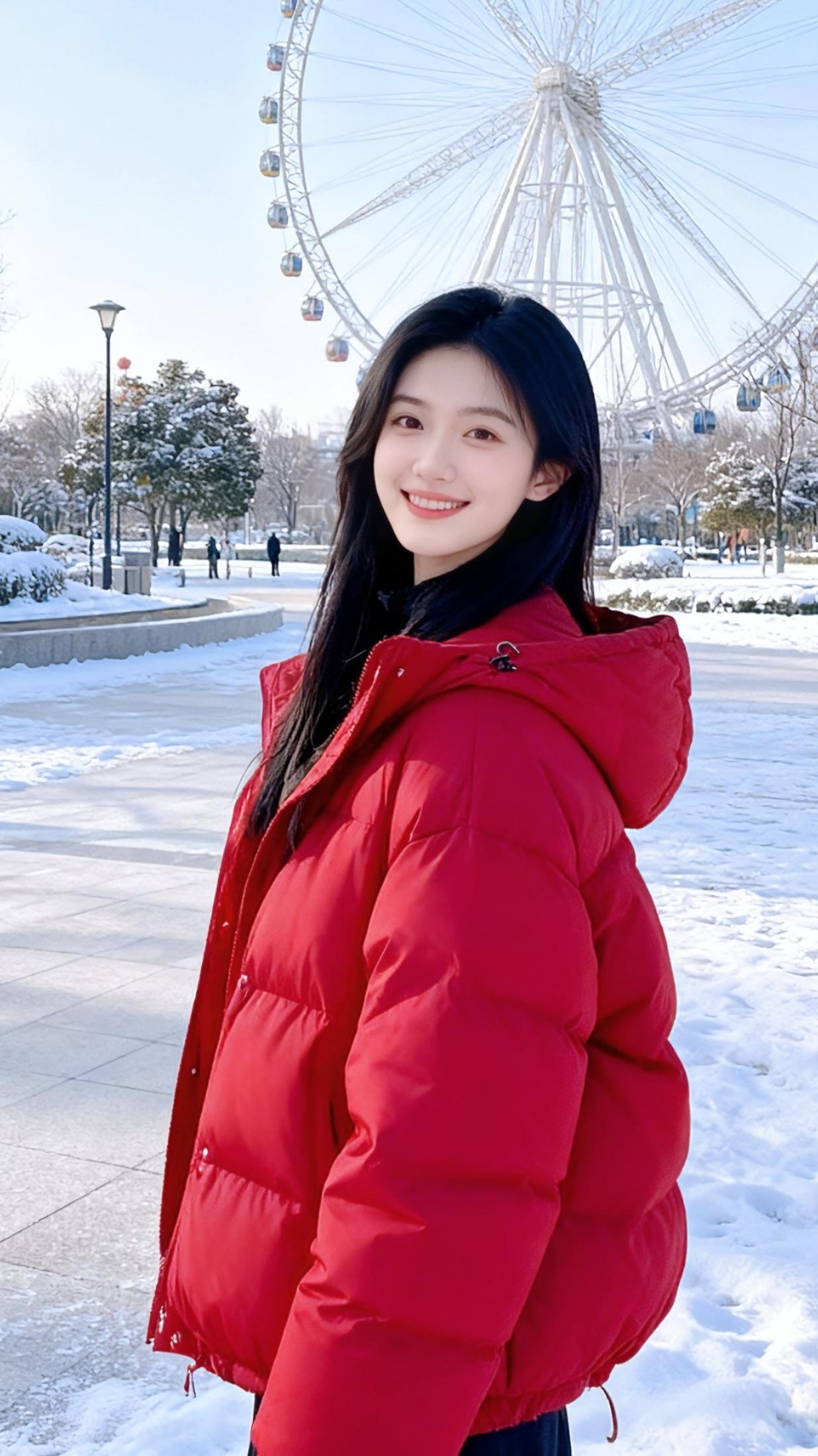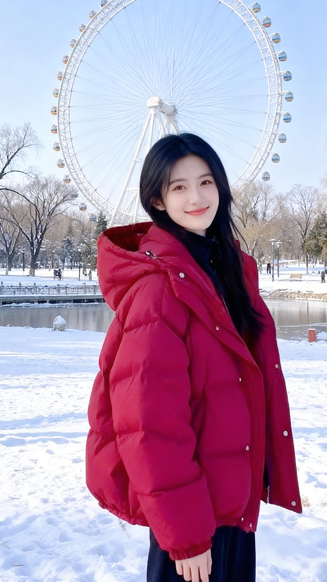 雪后的公园像被揉碎的月光铺了满地,她裹着一身热烈的红,像枝莽撞撞跳进冬夜的梅。 摩天轮的钢骨在蓝天里支起巨大的圆,冰棱挂在轿厢边缘,风一吹就晃出细碎的光。她的笑是雪地上最暖的褶皱,连落满白霜的枝桠都跟着软下来——原来冬天不是只有冷,还有红袄子裹着的热乎气,和比阳光更亮的眼睛。 风裹着雪粒子擦过她的发梢,她抬手指向摩天轮的最高点,像要把这一整个冬的温柔,都攥进通红的掌心里。 高级感穿搭 小个子穿搭 美女街拍穿搭