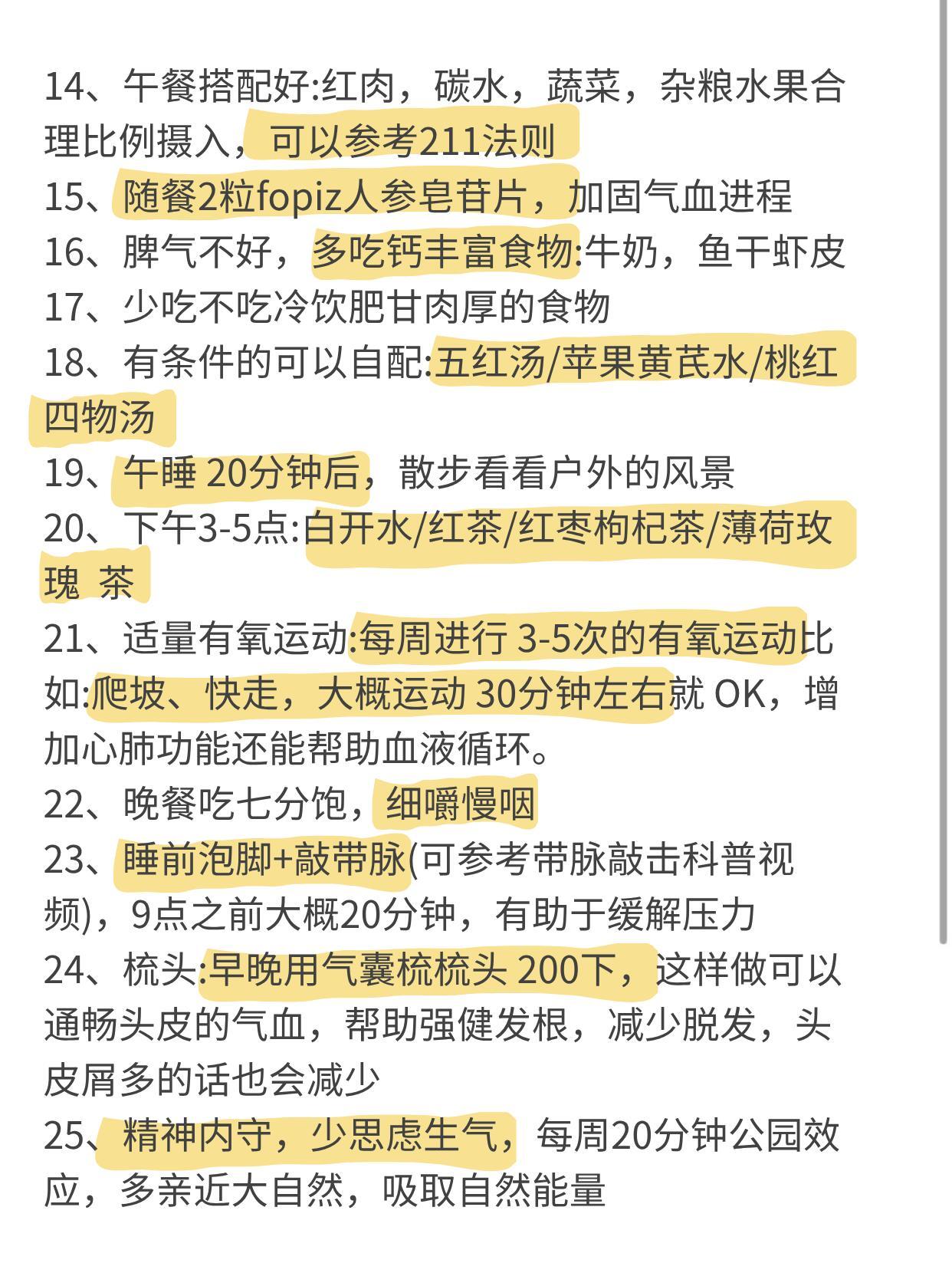 分享我一个完美的养生闭环(秋冬):1、睡眠:好的睡眠是气血的“滋补品”,晚上11点前强制“关机”,早上7点强制“开机”2、起床五部曲:揉腹,叩齿,伸懒腰,捏眉毛,梳头3、做腹部深呼吸:呼吸要深且慢4、空腹吃三颗红皮生花生,然后喝温水5、做好房间卫生,整洁通风,穿宽松棉麻的衣物6、吃早餐,七分饱,不吃太烫太凉的食物7、多吃五谷杂粮:有空可以煮一碗温热的五谷米糊,红豆、黑米、花生、大米、红枣,加少许红糖,全部倒入破壁机,五谷杂粮最能补气血8、坚持吃红枣和桂圆干,可以当气血小零食9、饭后拍pp+拍八虚(拍手臂窝-腋下-腹股沟-腿窝)10、不久坐,每坐2-3小时,起身走动10分钟11、用眼法则:远眺,20-20-20,保护眼睛12、特殊时期特别呵护:红糖,生姜,玫瑰,核桃,木耳,红枣,枸杞常备13、出门做好保暖,保护阳气(头,颈,肚,腿,脚印),不想穿秋裤的可以尝试加绒长筒袜健康养生