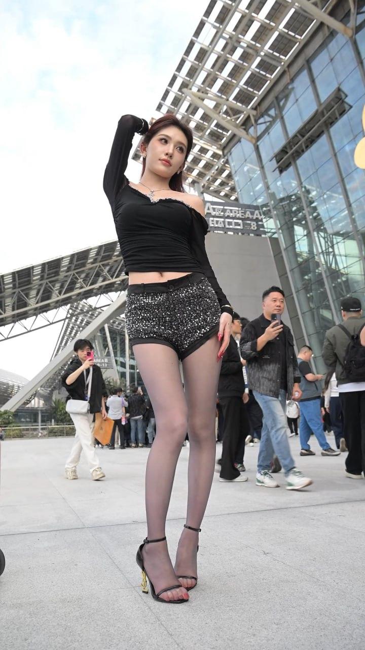 穿成这样逛展会,到底是辣还是过? 黑露肩衫裹得紧身,亮片短裤闪得晃眼。灰丝贴腿,