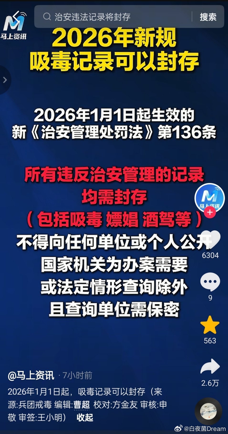 2026年1月1日起生效,所有违反治安管理的记录均需封存。(包括吸毒 嫖娼 酒驾等)