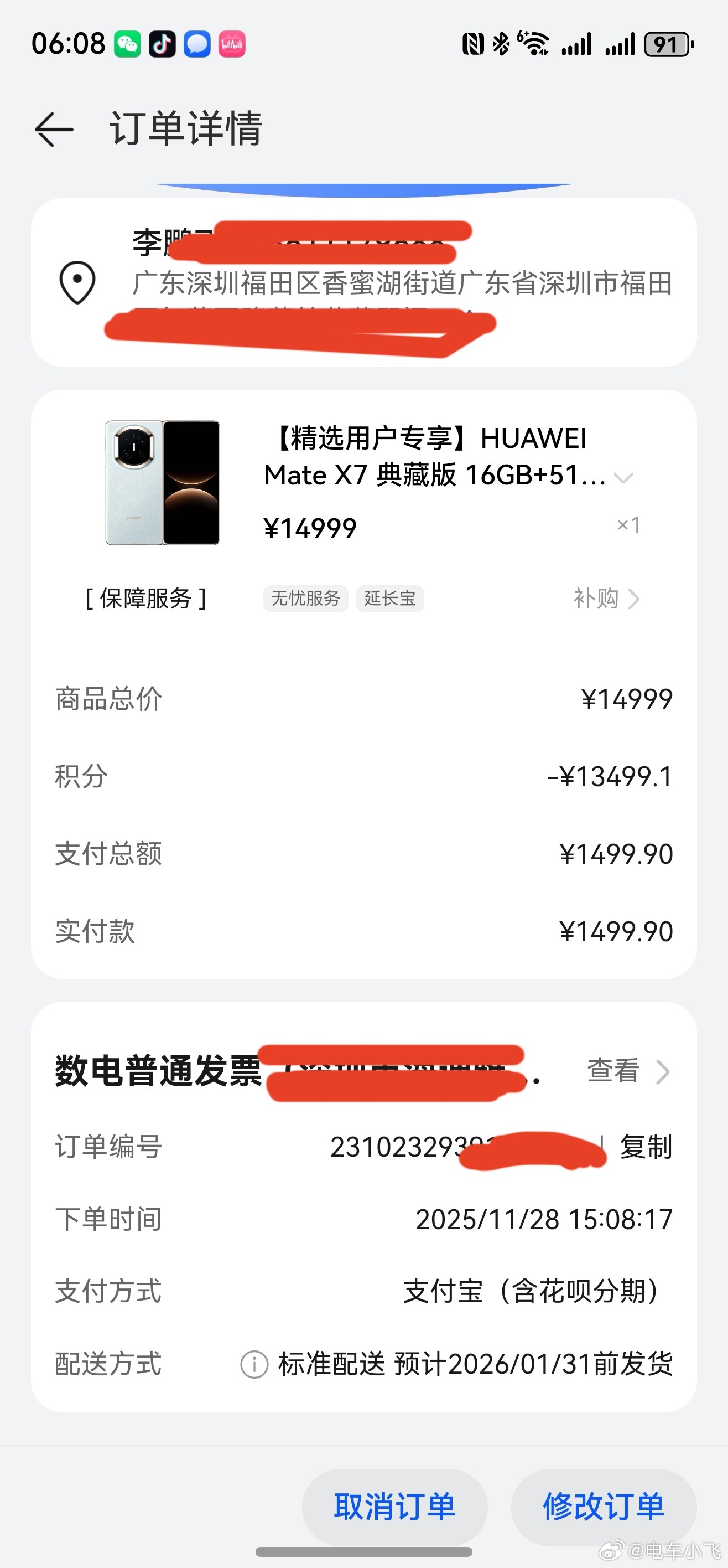 鸿蒙智行积分太硬了,今天还用积分换购了Mate X7典藏版,积分抵扣了13499元,只要再付1499元就行。太爽了。