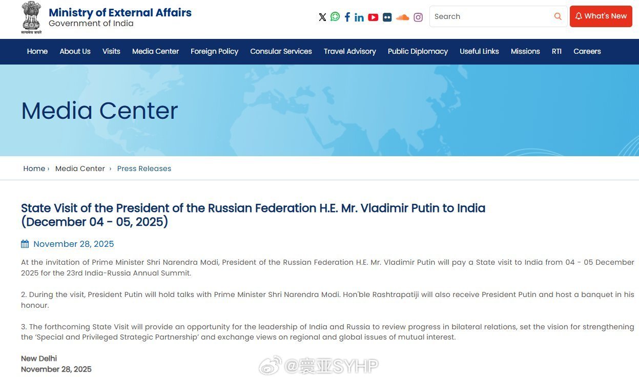 普京将访问印度 应印度总理莫迪邀请,普京将于12月4日至5日对印度进行国事访问。