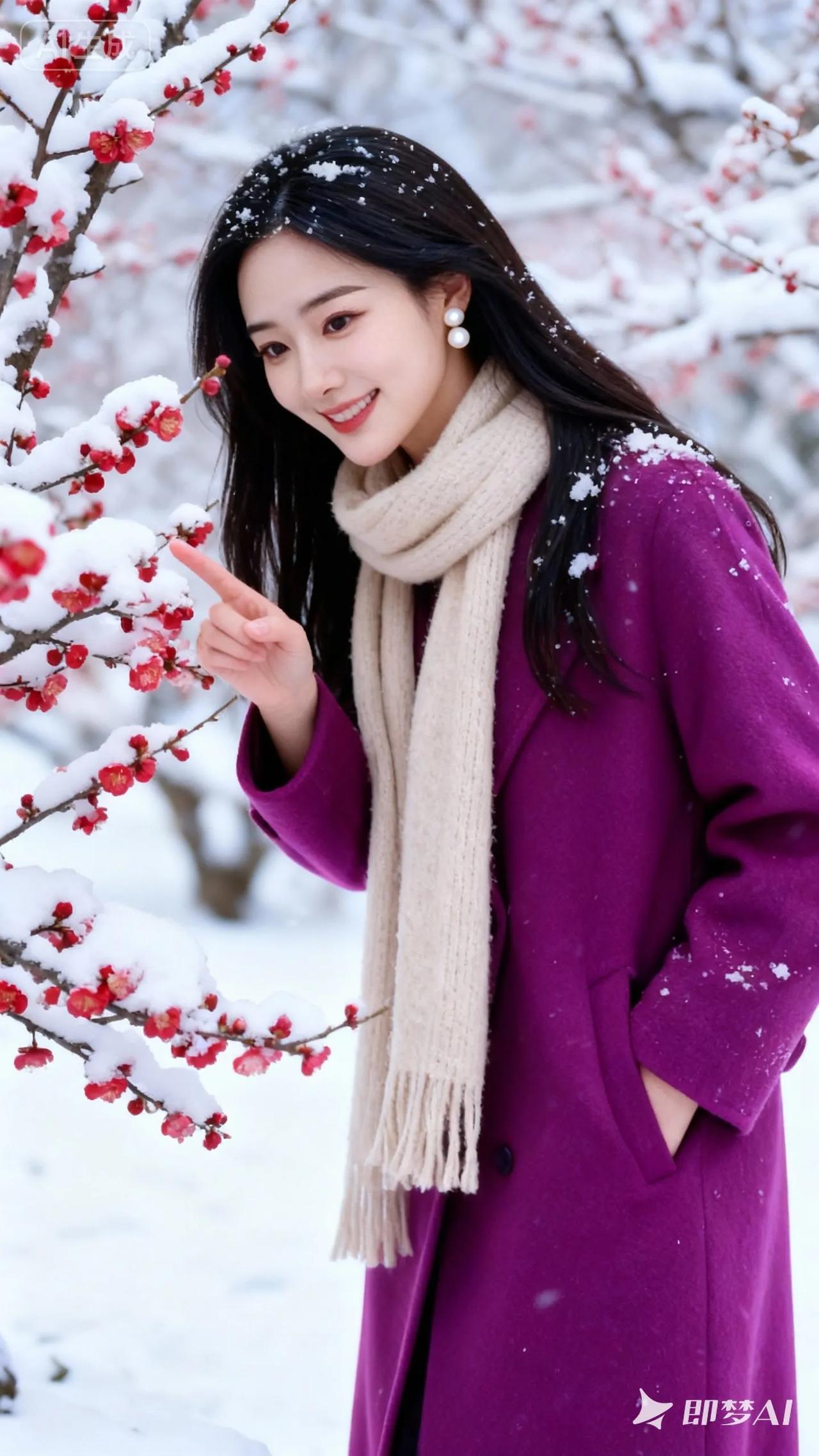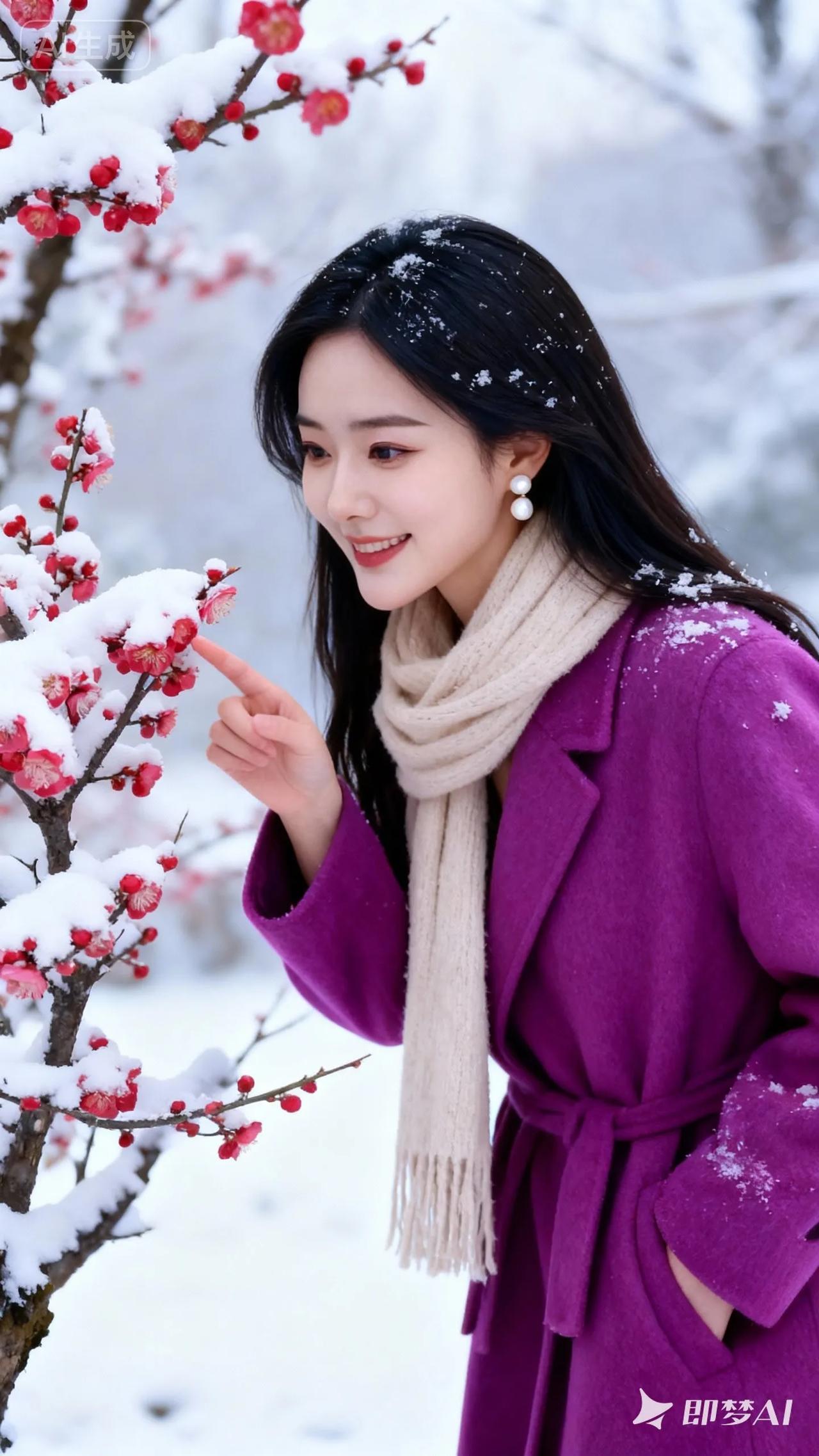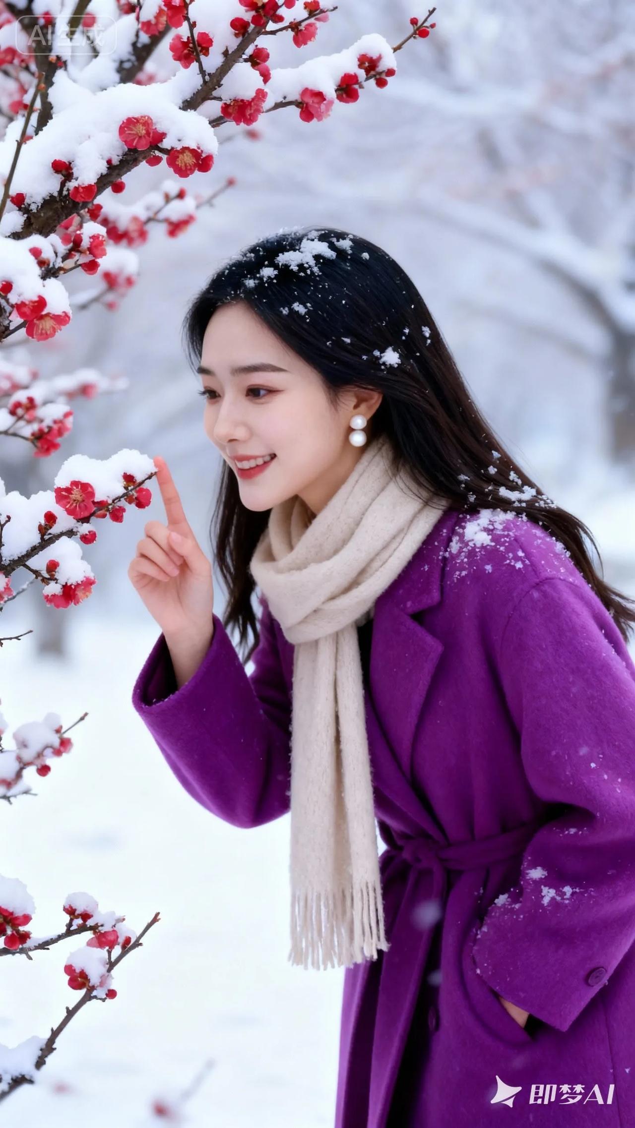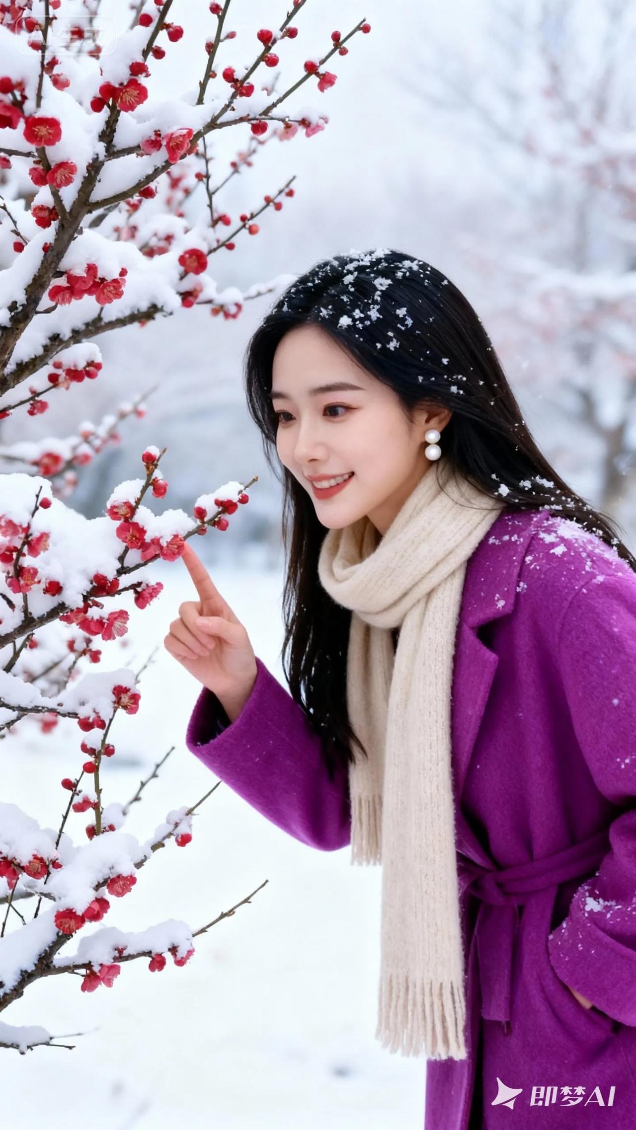冬日雪景中的少女,红梅点缀,温暖微笑。