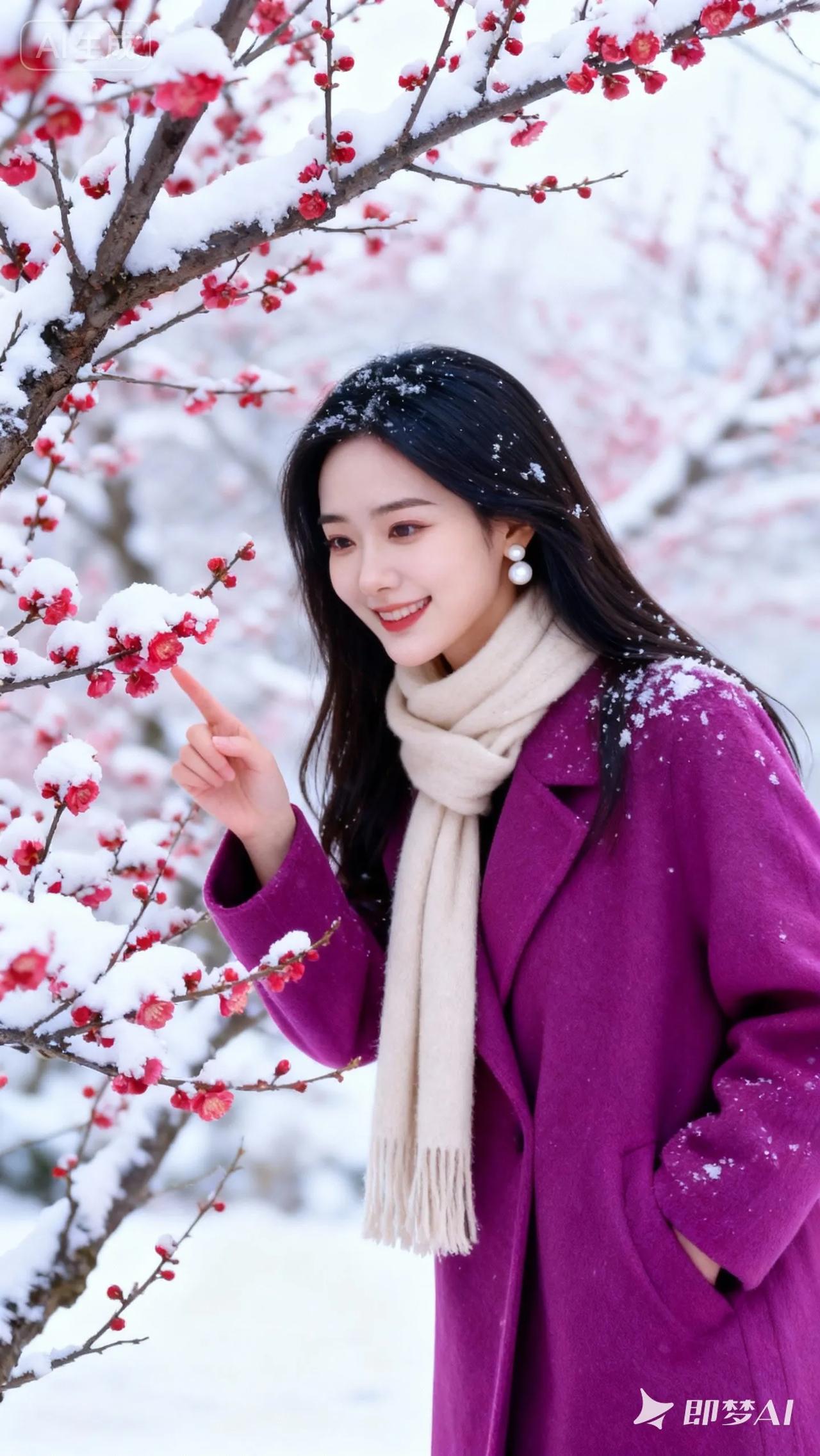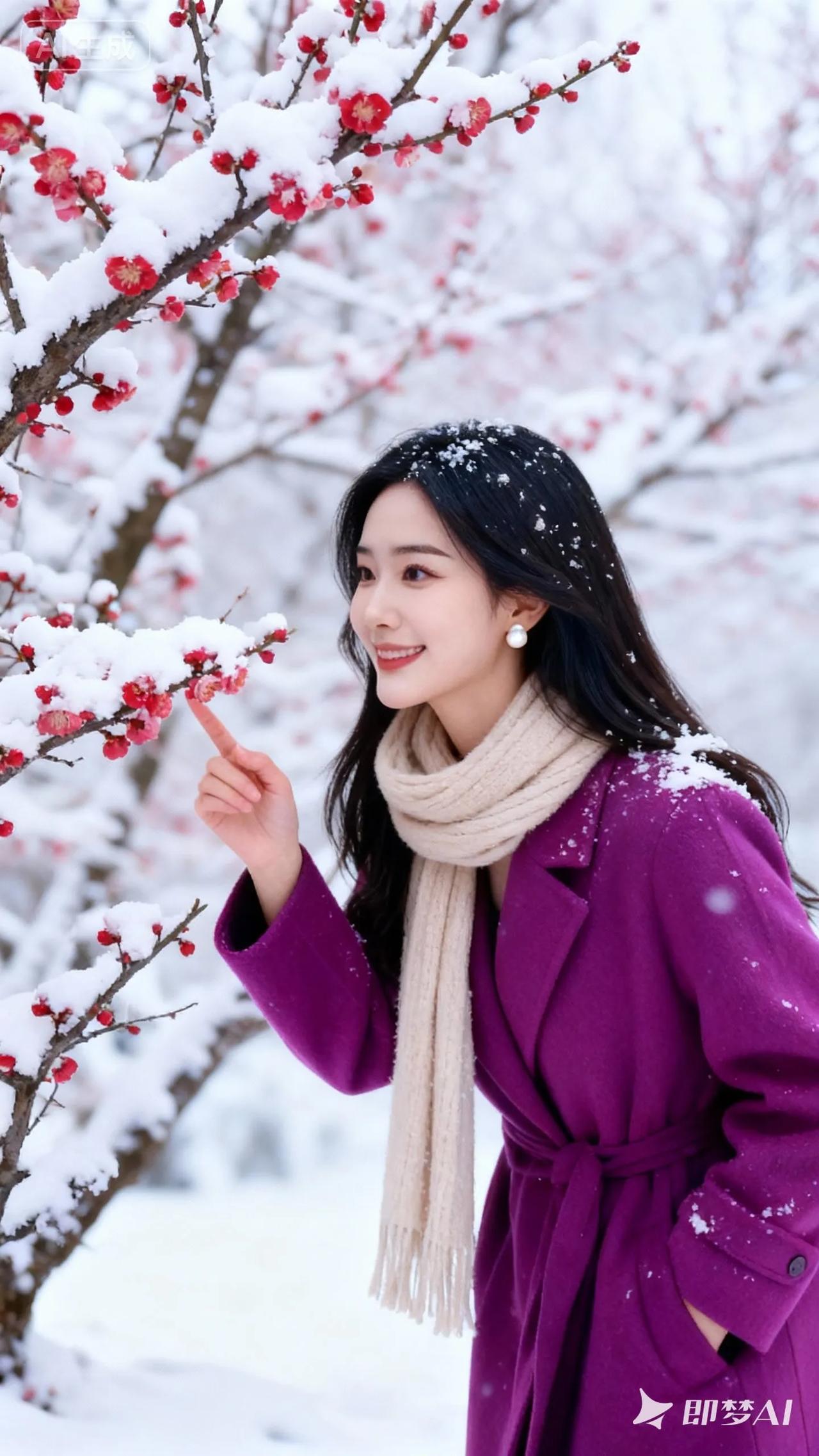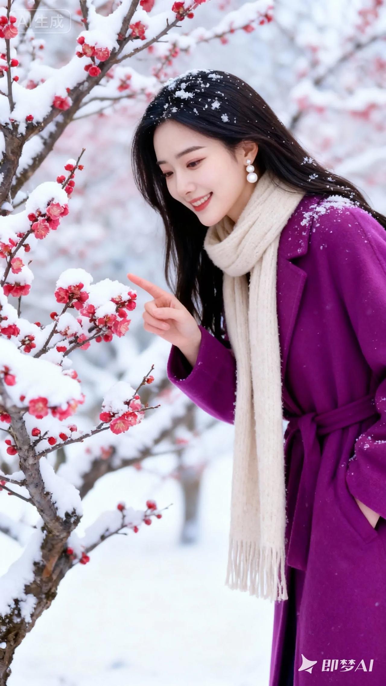 冬日雪景中的少女,红梅点缀,温暖微笑。