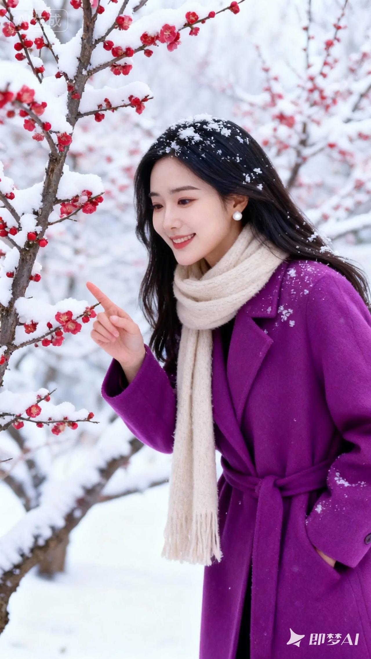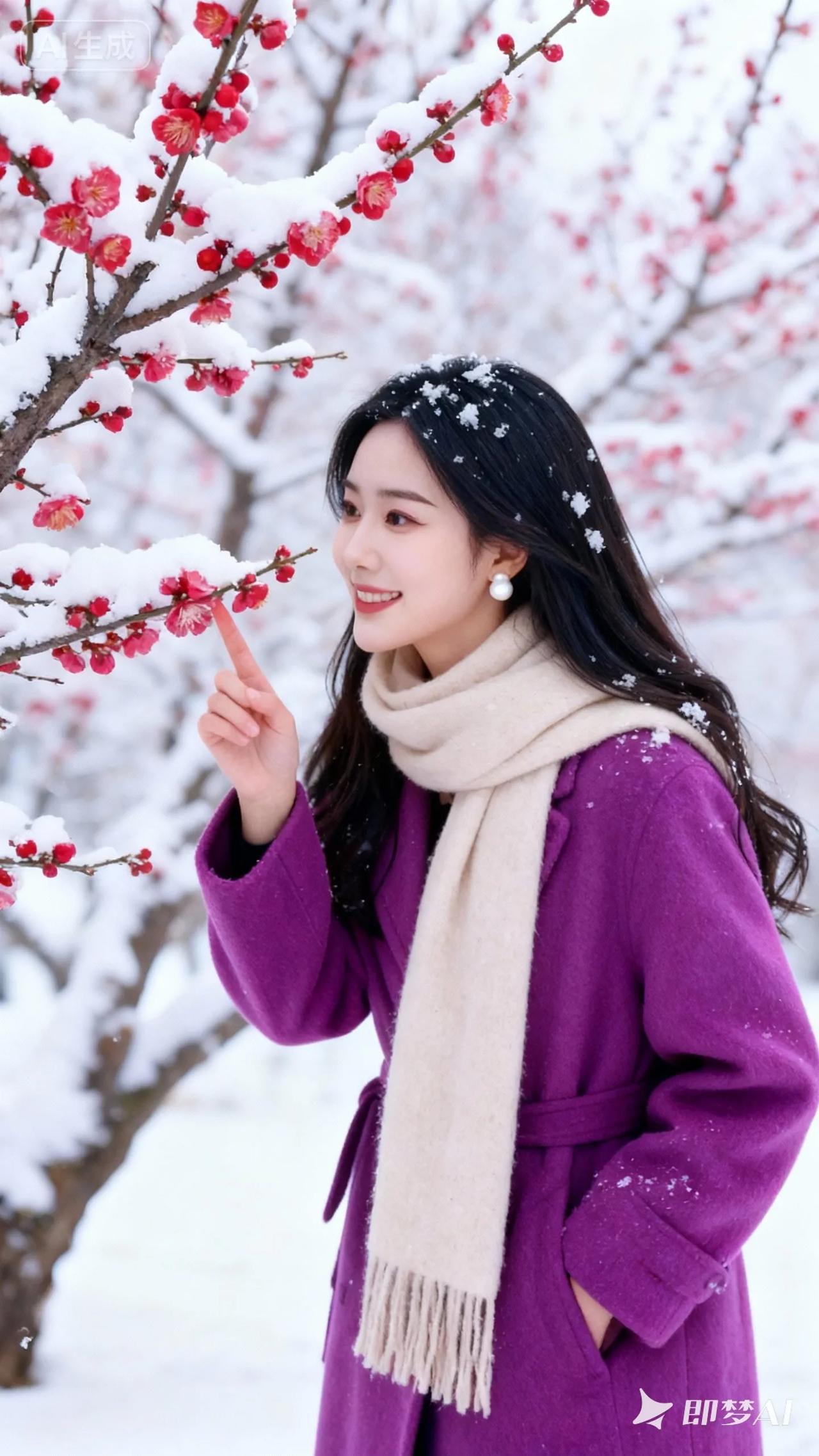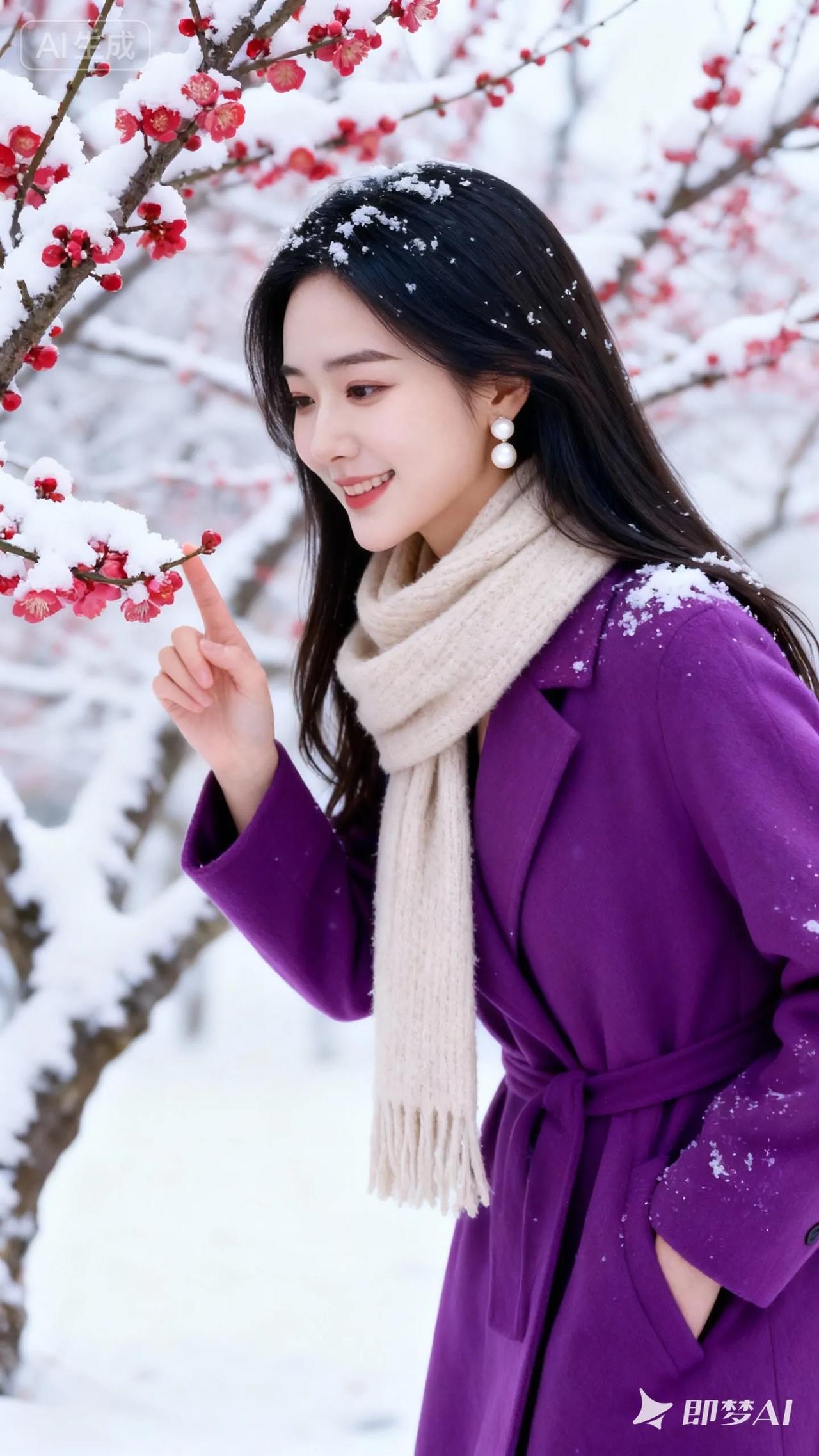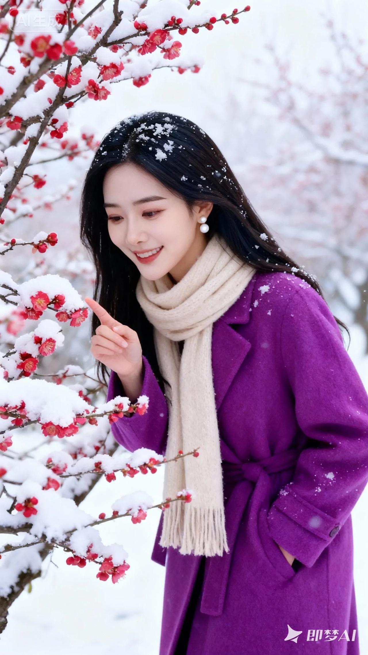 冬日雪景中的少女,红梅点缀,温暖微笑。