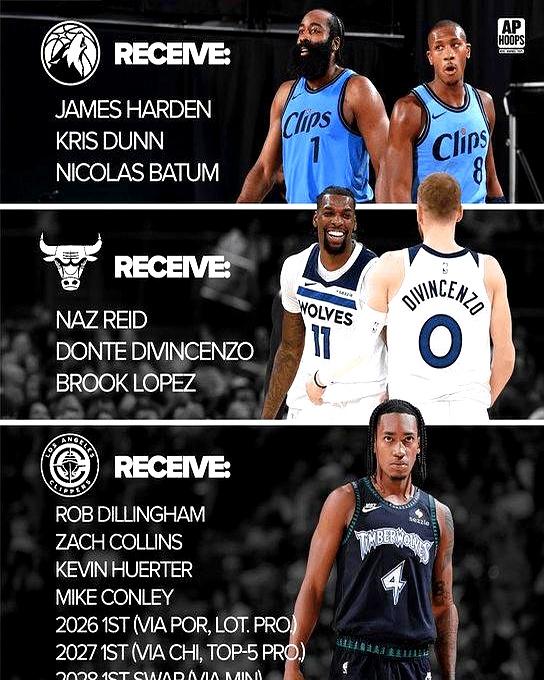 美媒APHoops刚曝了个三方交易方案,快船、森林狼、公牛三家换,还说“三赢”。 森林狼拿哈登、邓恩、巴图姆——他们缺控卫好久了,哈登今年状态还行,和爱德华兹搭档,冲冠的底气能足点。 公牛拿里德、迪文琴佐、大洛——都是即战力,公牛阵容缺深度,这仨过来刚好补,说不定能多赢几场。 快船拿迪林厄姆(年轻球员)、扎克-柯林斯、赫尔特、康利,还有26、27、30年三个首轮,28年首轮互换——这明显是要重建了啊,总比抱着老阵容打不动强,拿一堆年轻的和选秀权,后续操作空间大。 不过交易能不能成还得看各队管理层点头,毕竟球员适配、选秀权价值才是关键,但这方案看着确实各取所需,不像瞎编的。