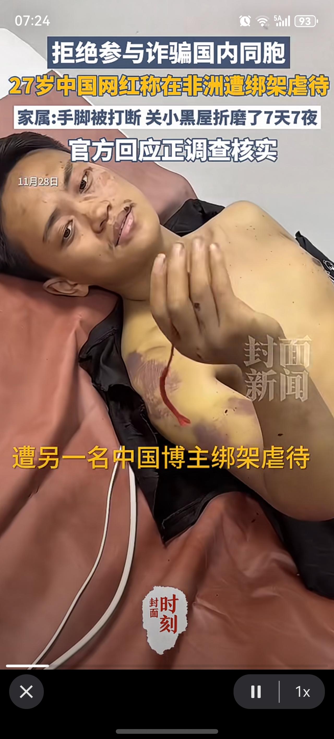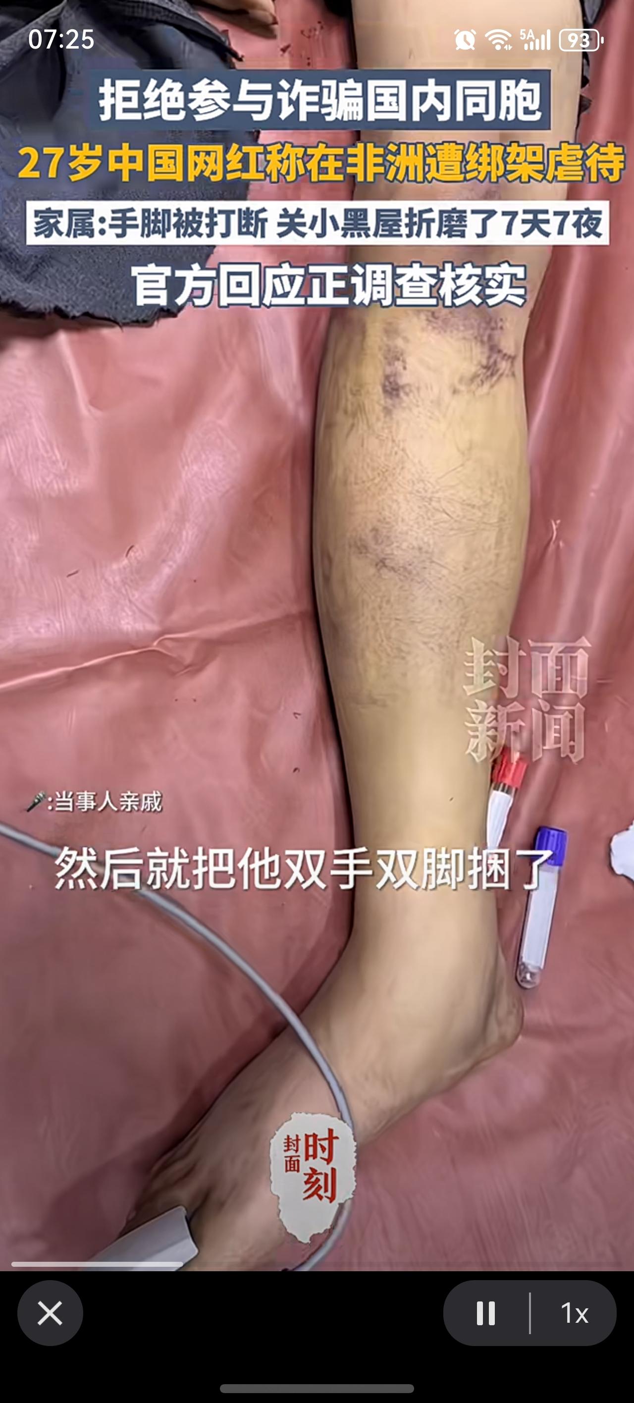 被非法拘禁七天,手脚还被打断! 拒绝参与诈骗国内同胞,27岁中国网红称在非洲遭另一名“中国博主”绑架虐待。 家属:“辣椒面撒在他的眼睛里,然后就把他双手双脚捆了,放在后备箱里,手脚被打断,关小黑屋活活的折磨了7天7夜。 他是看到机会冒险跳车逃生,很幸运的获得当地居民救助,目前在当地医院治疗,他自己表示:现在很安全,手机被抢走了,如果像你们借钱请千万别转账! 官方回应正调查核实!