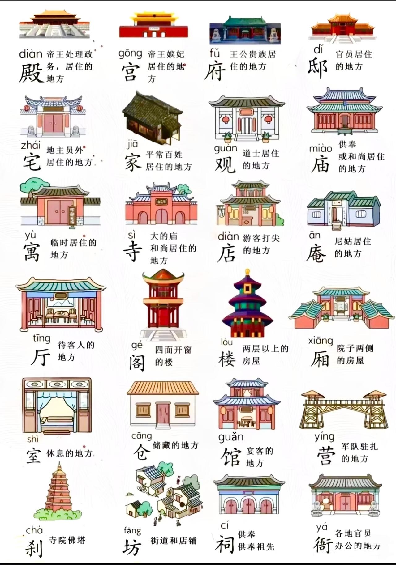 收藏!20个中国古建筑称呼图鉴:从“殿”到“衙”,一秒分清古代住所等级 你知道“殿”“宫”“府”的区别吗?同样是住人的地方,帝王、贵族、平民的住所称呼天差地别——这张图把古代建筑的“身份密码”全说透了! 一、不同身份的专属住所 从最高等级开始: 帝王专属:“殿”是理政+居住的地方(比如故宫太和殿),“宫”是妃嫔居住的区域(如乾清宫); 权贵阶层:王公贵族住“府”,官员住“邸”,地主员外住“宅”; 普通百姓:平常人家叫“家”,临时落脚是“寓”。 二、特定人群的专属建筑 不同职业、身份也有对应的场所: 宗教相关:道士住“观”,和尚住“庙寺”,尼姑住“庵”,寺院佛塔叫“刹”; 功能场所:游客歇脚是“店”,军队驻扎叫“营”,储藏物品用“仓”,街道店铺称“坊”。 三、建筑的功能细分 哪怕是同一处宅院,不同区域也有专属称呼: 待客用“厅”,休息叫“室”,院子两侧的房屋是“厢”; 两层以上的建筑称“楼”,四面开窗的楼叫“阁”,宴客的地方是“馆”。 这些称呼藏着古代的等级秩序和生活智慧,下次看古装剧、逛古建筑,就能一眼分清!赶紧收藏这张图,以后再遇到“殿”“宫”“府”再也不会迷糊啦~