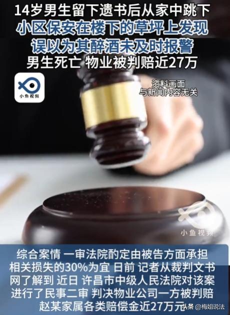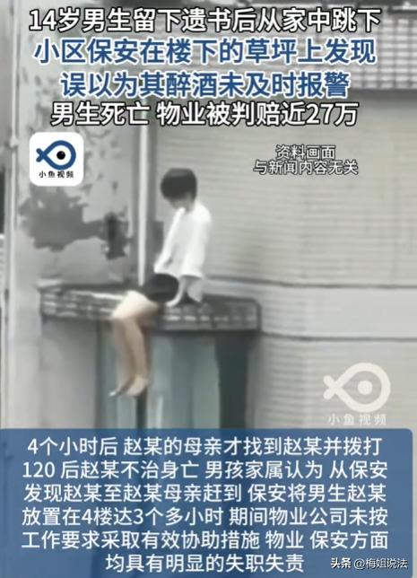 河南许昌,一名14岁的中学生赵某,在留下遗书后,从自家10层的家中纵身跳下。小区保安在楼下的草坪发现了赵某,可他们却误以为赵某是醉酒状态,保安既没报警,也没有拨打120电话,而是将赵某架到了4层,说是让他醒酒,就这样过去了4个小时,赵某的母亲才找到儿子并打了120,赵某最终还是没能抢救过来,不幸离世。赵某的家属认为物业和保安存在失职行为,应当承担责任,最终法院这样判了。 去年11月17日下午,14岁的中学生赵某,不知承受着怎样的压力与痛苦,留下遗书后,从10楼的家中毅然跳下。 当天18时许,小区保安孙某和李某在楼下草坪发现了赵某。 此时的赵某身体根本无法自立,可保安却主观臆断,认为他是喝多了,是醉酒状态。 保安询问后,赵某回应了楼栋单元,保安却听成了401户,还问要不要报警打120,赵某说不需要。 保安没有进一步确认情况,也没有采取任何有效的救助措施,直接把赵某架到4楼就离开了。 直到21时30分,赵某的母亲才终于找到了儿子。 21时50分,120赶到现场,可已经来不及了,22时54分,宣布赵某已离世。 赵某的家属认为:物业和保安没有尽到应有的责任,要求他们担责。 毕竟,保安作为小区的安全守护者,在发现有人可能受伤的情况下,却做出了错误的判断和处理,这无疑是对生命的漠视。 物业作为管理方,也有着不可推卸的责任。 那么,物业和保安到底该承担怎样的责任呢?他们真的失职了吗? 1,物业和保安,对赵某有没有救助义务呢? 根据《民法典》第1198条规定,宾馆、商场、银行、车站、机场、体育场馆、娱乐场所等经营场所、公共场所的经营者、管理者或者群众性活动的组织者,未尽到安全保障义务,造成他人损害的,应当承担侵权责任。 小区属于公共场所,物业作为管理者,对小区内的人员有安全保障义务。 保安作为物业工作人员,在发现赵某受伤躺在草坪时,就有义务对其进行救助,比如及时拨打120、报警等。 保安发现赵某后,没有正确判断赵某的情况,误以为其醉酒,在赵某表示不需要报警打120后,就将其架到4楼离开,没有尽到合理的救助义务。 物业作为保安的管理者,对保安的失职行为应该承担相应责任。 所以,物业和保安对赵某是有救助义务的,他们没有履行好这个义务,就应该担责。 2,物业和保安的过错程度,该如何认定呢? 据《民法典》第1173条规定,被侵权人对同一损害的发生或者扩大有过错的,可以减轻侵权人的责任。 赵某是 自 杀,家属作为监护人,对赵某的日常行为,有一定的监护责任。 如果家属能够及时发现赵某的异常,给予关心和疏导,或许这起悲剧就不会发生。 所以,家属在这起事件中,也有一定过错。 而物业和保安,在发现赵某后,没有正确判断其情况,没有及时采取有效的救助措施,导致赵某错过最佳救治时间,最终离世。 他们的过错程度,相对较大。 最终,一审法院经过审理,考虑到赵某自杀这一情况,认为家属监护责任不明,但物业协助救助不力,判定物业承担30%的责任。 物业不服上诉,二审法院认为一审判决合理,维持物业担责,判物业赔偿赵某家属254027.4元损失和15000元精神抚慰金,合计269027.4元。 【信息来源: 14岁男生从10楼坠楼,保安误以为其醉酒未及时报警,男生死亡物业被判赔近27万元 2025-11-28 10:09·新法治报】
