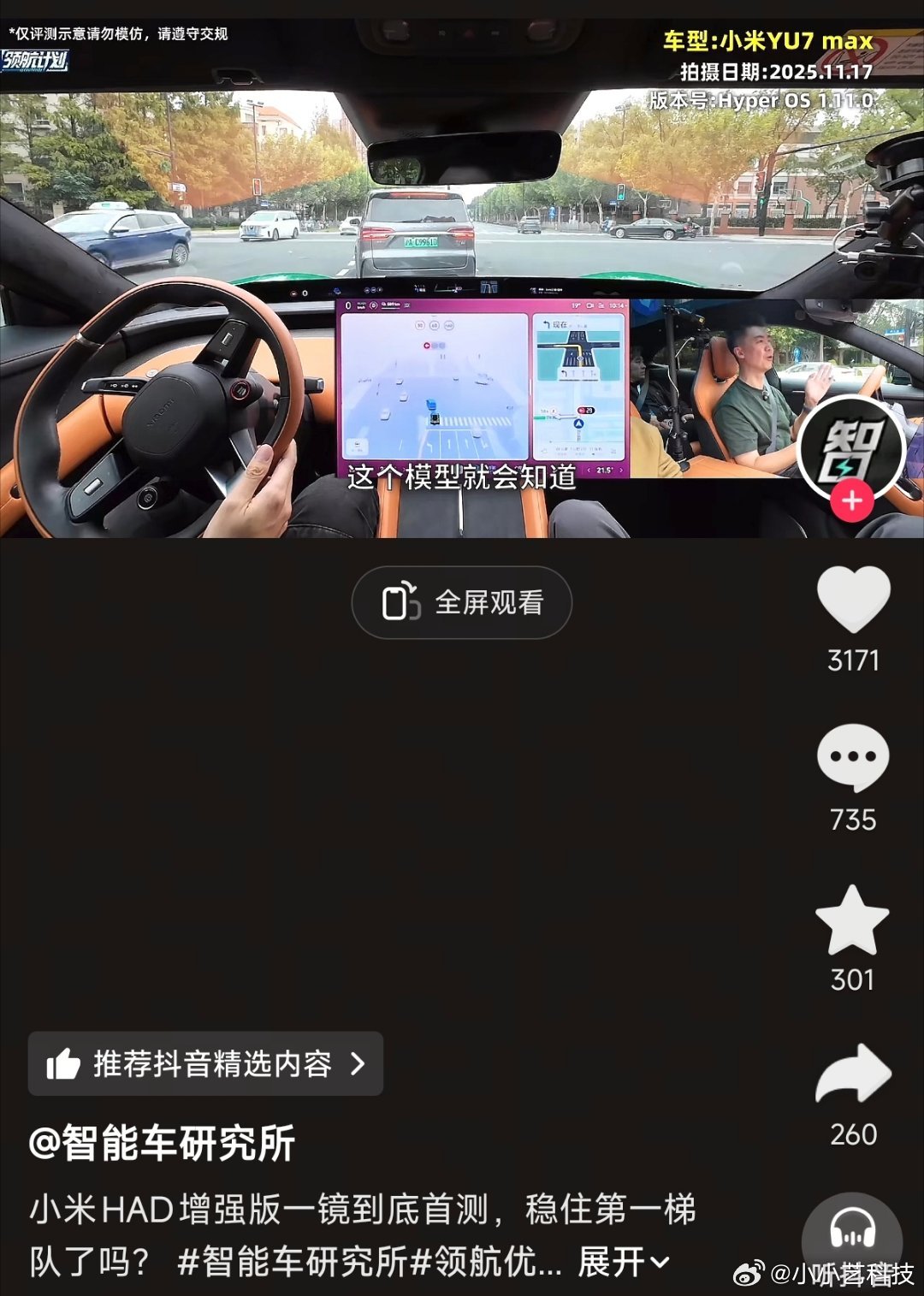 在可量化的测试中,小米的表现,是一如既往的稳定且领先。小米YU7续航最长,小米SU7达成率最好,小米汽车安全性评测全优“大满贯”,小米SU7 Ultra 纽北赛道成绩创造历史,……………………在一项项可量化、标准的测试中,小米汽车的成绩都非常不错。近期,小米推送HAD增强版辅助驾驶系统,有不少车主在体验后,均表示相比上一个版本的体验,提升非常大,特别是城区道路的判断、雪糕桶道路的处理等出奇的丝滑。当然,并不是全部完美,在特殊道路依旧需要驾驶员专注配合处理。智驾(智能辅助驾驶)不是护城河,这个观点我一直坚信,可以把新能源汽车的智驾作为亮点、卖点来推广,但不能是主要亮点和卖点,汽车安全、地盘操控等应当排在智驾之前。
