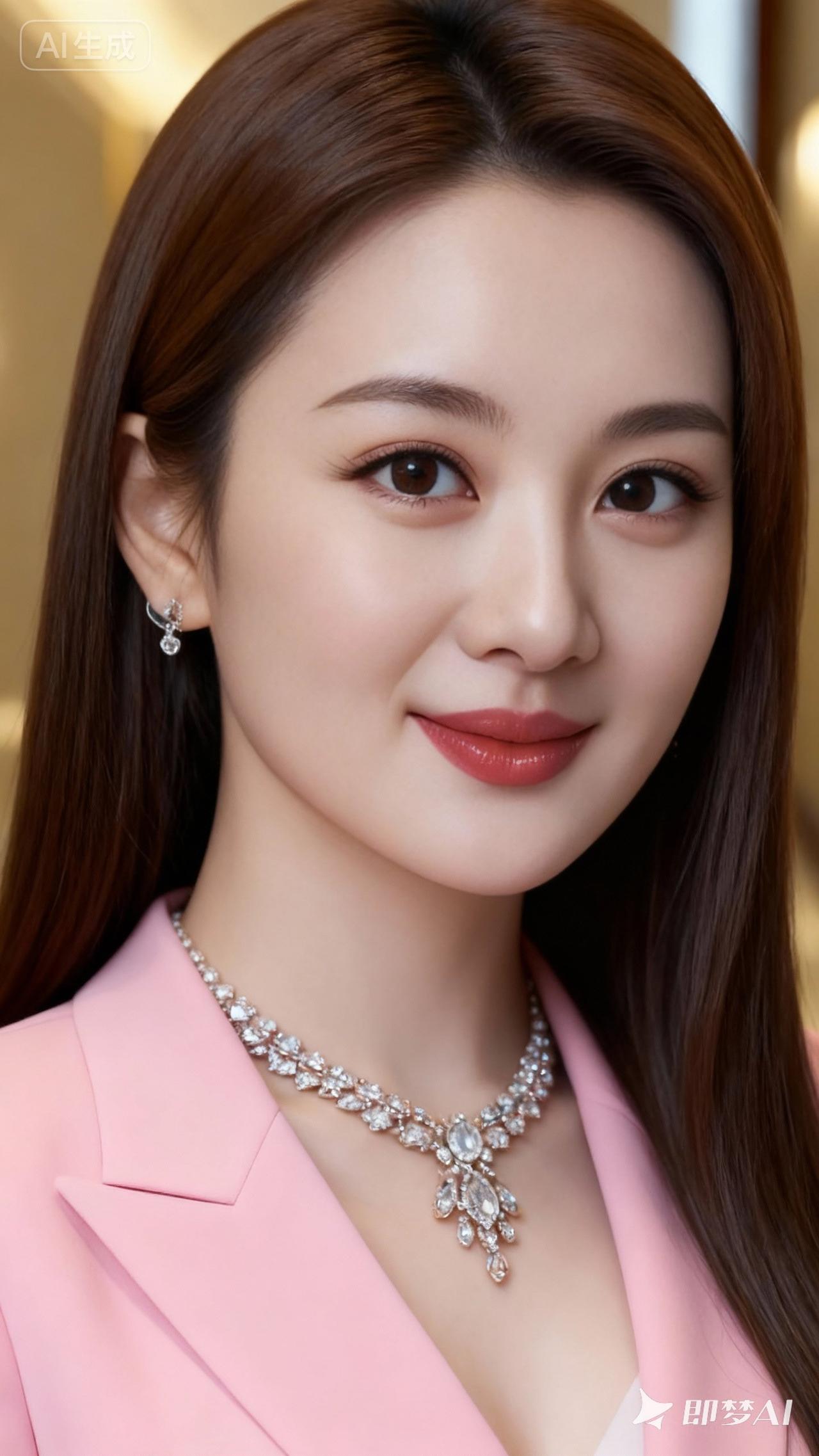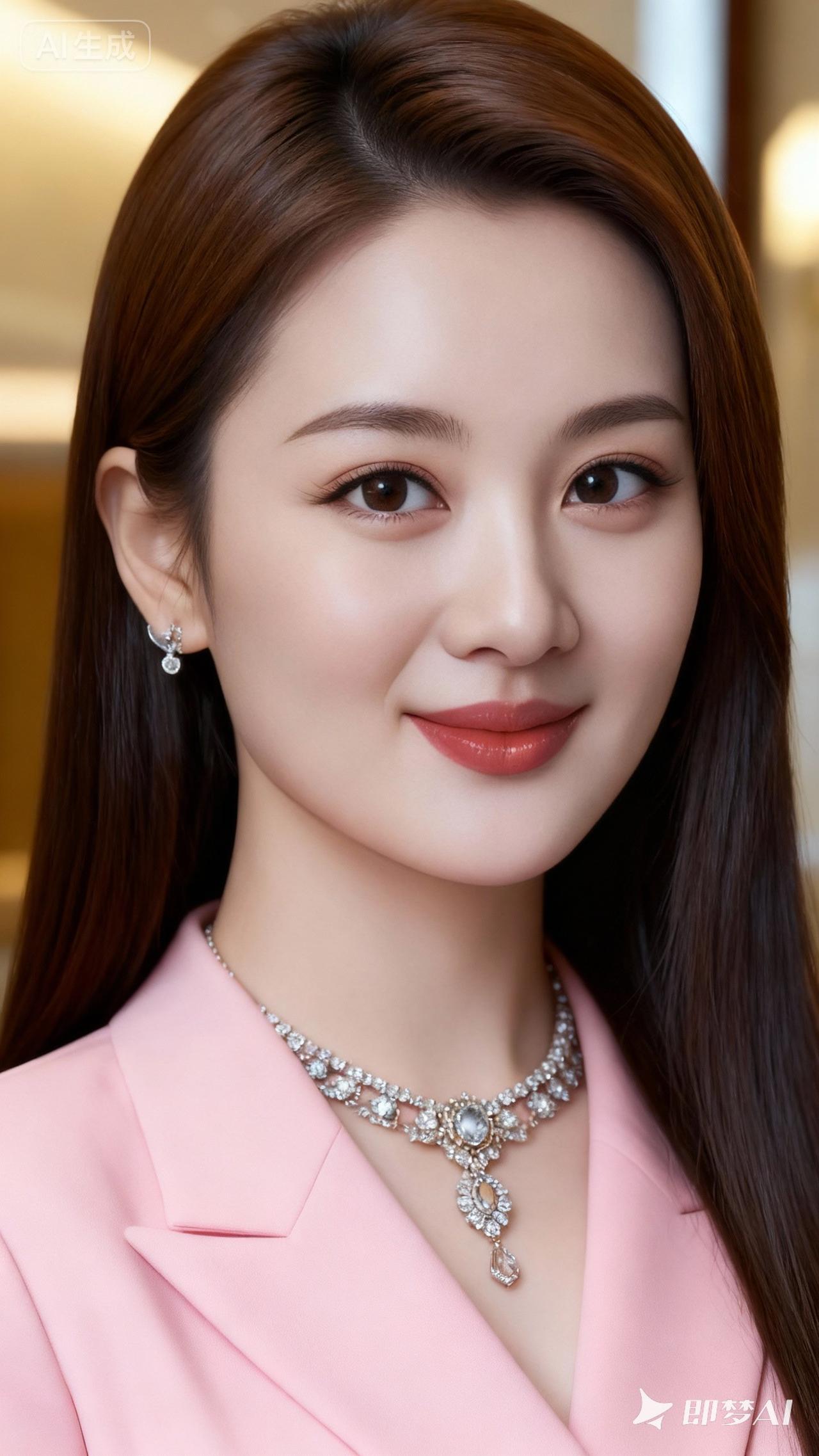 蓝光 高个 大眼睛 棕色长直发 粉色色职业套装 脖颈名贵珠宝 高贵高颜妆容