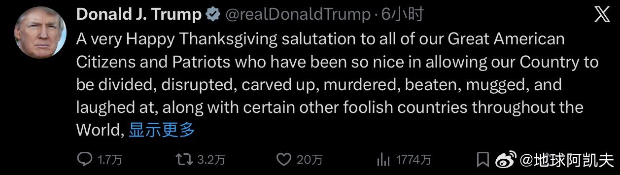 ‼️感恩节,特朗普发千字长文揭露左派长期卑劣作为:“向所有伟大的美国公民和爱国者致以最诚挚的感恩节问候!感谢你们如此“仁慈”,任由我们的国家被分裂、扰乱、瓜分、谋杀、殴打、抢劫,甚至被嘲笑,就像世界上某些愚蠢的国家一样,仅仅因为在移民问题上奉行“政治正确”,实际上却是愚蠢至极。美国官方统计的外国人口为5300万(人口普查数据),其中大部分依靠福利救济,来自失败国家,或来自监狱、精神病院、帮派或贩毒集团。他们和他们的孩子依靠爱国的美国公民的大量资助生活,而这些公民出于“善良的本性”,不愿公开抱怨或以任何方式制造麻烦。他们忍受着我们国家所发生的一切,但这正在吞噬着他们的内心!一个持有绿卡、年收入3万美元的移民,每年大约能为他的家庭领取5万美元的福利。而实际的移民人口远不止于此。难民负担是美国社会功能失调的主要原因,而二战后这些问题并不存在(例如学校办学失败、犯罪率高企、城市衰败、医院人满为患、住房短缺、财政赤字巨大等等)。举例来说,数十万索马里难民正在彻底占领曾经繁荣的明尼苏达州。索马里团伙在街头游荡,寻找“猎物”,而我们善良的民众却只能把自己锁在公寓和房子里,祈祷着能平安无事。明尼苏达州那位智障严重的州长蒂姆·沃尔兹(Tim Walz)什么也不做,要么是出于恐惧,要么是出于无能,或者两者兼而有之。而我们国家最糟糕的“国会议员/女议员”伊尔汗·奥马尔(Ilhan Omar),总是裹在她那像襁褓一样的头巾里,她很可能是非法入境美国的(因为在美国,你不能和你的兄弟结婚),她除了满腹牢骚地抱怨我们的国家、宪法以及她自己受到的“不公”待遇之外,什么也不做。要知道,她的祖国是一个颓废落后、犯罪猖獗的国家,由于缺乏政府、军队、警察、学校等等,那里实际上根本算不上一个国家。即便我们在科技方面取得了进步,移民政策却侵蚀了这些成果,并损害了许多人的生活条件。我将永久暂停所有第三世界国家的移民,以使美国系统得以全面恢复;终止所有数百万拜登非法入境的案例,包括那些由瞌睡乔·拜登的自动签发的申请;驱逐所有对美国无益或无法热爱我们国家的人;终止所有向非美国公民提供的联邦福利和补贴;取消破坏国内安宁的移民的公民身份;驱逐所有构成公共负担、安全风险或与西方文明不相容的外国公民。这些目标旨在大幅减少非法和扰乱秩序的人口,包括那些通过未经授权的非法自动签发程序入境的人。只有逆向移民才能彻底解决这个问题。除此之外,祝所有人感恩节快乐,除了那些仇恨、偷窃、谋杀和破坏美国一切价值观的人——你们不会在这里待太久!”热点现场海外编译精选海外新鲜事