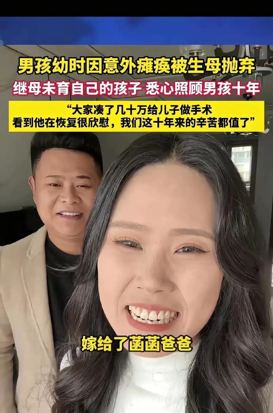 安徽亳州,男孩6个月大时被查出神经母细胞瘤,在做切除手术时,不慎伤到脊柱神经,导致下半身瘫痪。母亲不堪重负离家出走。 怎料,父亲给他找了一个19岁的后妈,谁曾想,就是这个后妈,在之后的日子里,对男孩的态度却让人意想不到! 说真的,刚看到这个消息,我心里咯噔一下。19岁啊,正是爱玩爱闹、享受青春的年纪,自己都还是个孩子,怎么可能照顾好一个下半身瘫痪、还患过重病的孩子?周围的邻居也都议论纷纷,有人说这女孩肯定是图钱,有人说她撑不了三个月就得走,连男孩的奶奶都偷偷抹眼泪,怕孙子再受委屈。 男孩叫小宇,当时才1岁多,因为神经损伤,不仅站不起来,连翻身都困难,还经常因为术后并发症发烧呕吐。后妈进门那天,穿着简单的牛仔裤和T恤,看起来怯生生的,面对小宇瘫软的双腿,她没有丝毫嫌弃,只是蹲下身,轻轻摸了摸小宇的头,说了句“以后我来照顾你”。 谁也没把这句话放在心上,可接下来的日子,她用行动打了所有人的脸。每天早上六点,她就起床给小宇擦身、换纸尿裤,然后做软烂的辅食,一勺一勺喂进小宇嘴里。小宇因为长期卧床,容易便秘,她就用棉签小心翼翼地帮他通便,从来没喊过一声脏、一声累。 为了让小宇的肌肉不萎缩,她特意查了康复训练的视频,每天坚持给小宇做按摩,从大腿到脚踝,每个部位都按到,力度掌握得恰到好处。一开始小宇不适应,总是哭闹,她就一边按摩一边唱儿歌哄他,有时候唱得自己嗓子都哑了,也舍不得停下。 有一次小宇突发高烧,烧到39度多,浑身发抖。那天晚上下着大雨,父亲外出打工没在家,她背着小宇就往医院跑,一路上深一脚浅一脚,雨水打湿了她的衣服和头发,她却死死护住背上的小宇,生怕他再受一点凉。到了医院,她跑前跑后挂号、拿药、输液,整整守了小宇一夜,直到天亮小宇体温降下来,她才靠在椅子上睡着了,眼里全是红血丝。 周围的人慢慢改变了对她的看法。邻居张大妈经常帮她照看小宇,感叹道:“这孩子真是个好人,比亲妈还上心!”小宇的奶奶更是把她当成了亲闺女,逢人就夸:“我家祖上积德,才遇到这么好的媳妇。” 小宇渐渐长大,到了上学的年纪,她又犯了难。学校离家有两公里,小宇坐轮椅不方便,她就每天推着轮椅送小宇上学、放学,不管刮风下雨,从未间断。为了让小宇能跟上课程,她还利用晚上的时间,自学小学的课本,然后教小宇认字、算数。小宇聪明懂事,知道后妈的辛苦,每次都会搂着她的脖子说:“妈妈,你真好,我以后一定好好孝敬你。” 有人问她,这么年轻,为什么不找个条件好的,反而守着一个瘫痪的孩子过日子?她只是笑了笑,说:“既然我嫁给了他爸爸,小宇就是我的孩子,我不能丢下他。再说,小宇那么可爱,跟他在一起,我很开心。” 其实,她也有过委屈的时候。有一次,她带着小宇去超市买东西,有人背后指指点点,说她“年纪轻轻不学好,找个二婚还带着个残疾孩子”。她听到后,眼泪在眼眶里打转,却还是强忍着,把小宇抱得更紧了。回到家,她躲在房间里哭了一场,可第二天,还是像往常一样照顾小宇,没有丝毫懈怠。 小宇的父亲每次打工回来,都会给她买些礼物,感激她对小宇的付出。他常说:“要不是你,我真不知道这日子该怎么过。”她总是摆摆手,说:“一家人,不用这么客气。” 现在,小宇已经8岁了,不仅能熟练地操作轮椅,还学会了自己穿衣、吃饭,学习成绩在班里也名列前茅。他经常在作文里写:“我的后妈是世界上最好的妈妈,她给了我第二次生命,我一定要好好学习,将来带她去看看外面的世界。” 这个19岁就扛起家庭重担的后妈,用她的善良和坚持,诠释了什么是真正的母爱。母爱从来不是血缘的专属,而是发自内心的责任和守护。她本来可以拥有更轻松的人生,却选择了一条最难走的路,用自己的青春,温暖了一个残缺的家庭。 各位读者你们怎么看?欢迎在评论区讨论。