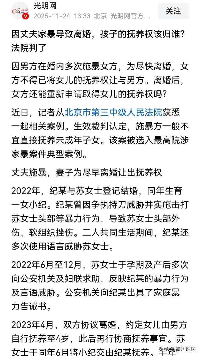 北京,苏女士婚后经常被丈夫威胁殴打,为了尽快离婚,苏女士不得不将女儿的抚养权让给