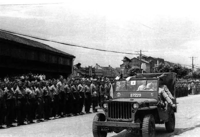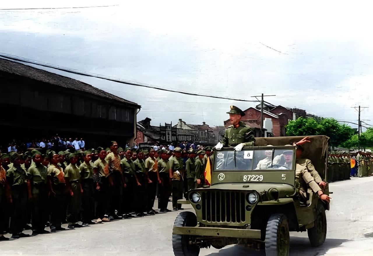 1946年,南京国统区,蒋介石身着军装站在车内,姿态正式地进行校阅复员的青年军;车旁及道路一侧,大批青年军身着统一制服、列队整齐站立。蒋介石此次校阅,既是对青年军 “抗战贡献” 的仪式性肯定,也暗含国民党对这一 “知识青年兵员群体” 的掌控意图(后续部分复员青年军人员被纳入国民党内战体系)。