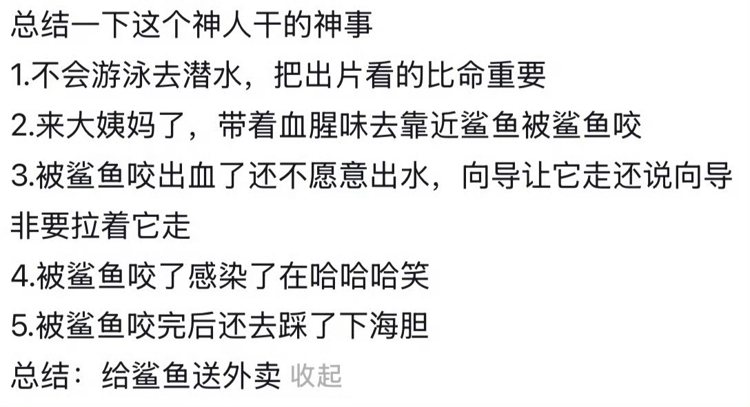 女子为出片生理期潜水被鲨鱼咬伤 就离谱,这心也太大了吧本地医院就简单处理了下,她自己完全没当回事,伤口都发紫渗血了,还笑着发视频说“没啥大事”。网友盯着伤口都看出感染迹象了,反复提醒她要警惕创伤弧菌,这可是“海洋无声杀手”,感染了会组织坏死甚至截肢,她愣是不听!海水里细菌那么多,开放性伤口不深度治疗,真的赌不起啊!别真为了流量把生命搭进去…