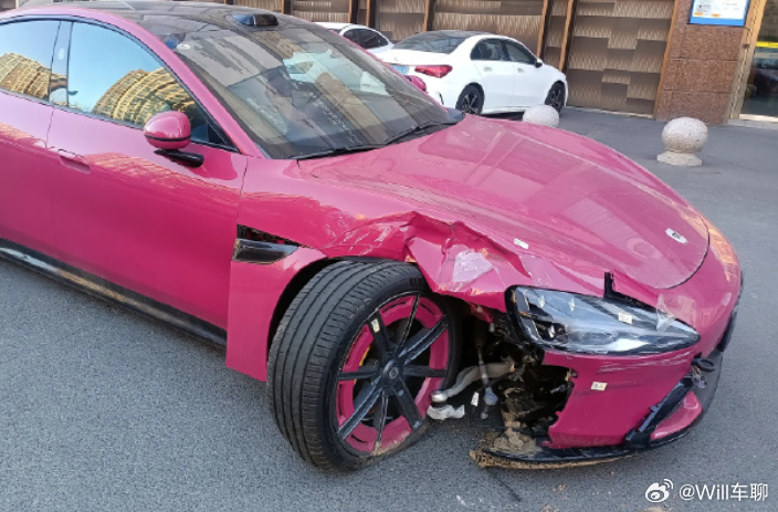 图1:正面25%小面积重叠碰撞的场景,车轮外翻,随着冲撞往外溃缩,避免轮胎向后侵入乘员舱,保持乘员舱内的安全。如果车轮不外翻,很有可能就随着正面冲撞后退,挤压驾驶舱内的人员脚部空间,最后造成驾驶舱内人员受伤。图2:这个外翻,真的不好说。 很明显不是正面小角度重叠碰撞所造成的了。感觉是硬物别在了轮胎上,硬生生怼断连接杆的。