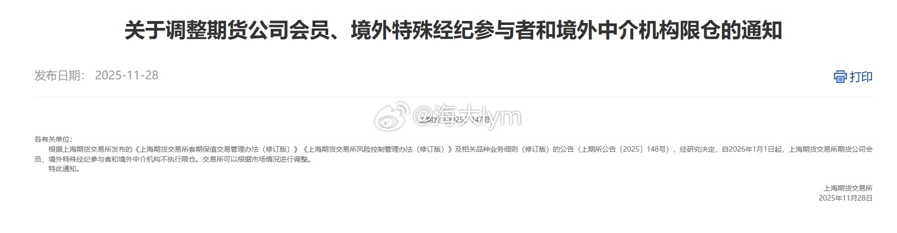 自2026年1月1日起,上海期货交易所期货公司会员、境外特殊经纪参与者和境外中介机构不执行限仓。交易所可以根据市场情况进行调整。