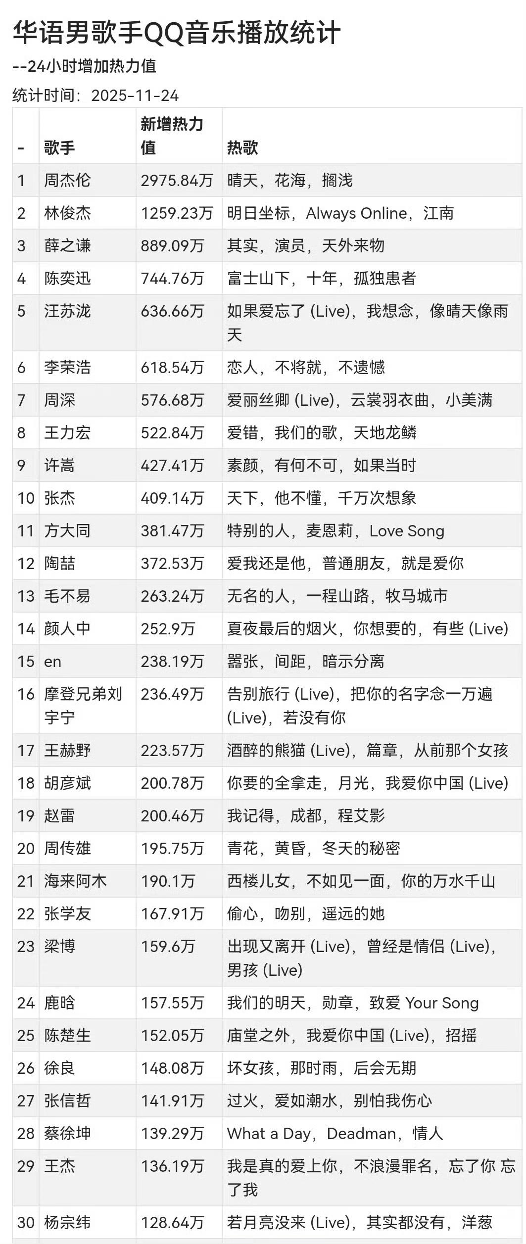 最新乐坛华语男歌手收听榜来了! 2025年11.23统计的QQ音乐华语主流歌手每日热力值增长TOP30排名出炉了。 排在前三的是周杰伦、林俊杰和薛之谦。 没想到汪苏泷拍到第五、周深第七、张杰在第十。 我喜欢的梁博排在第23名,陈楚生第25名,他的热力值歌曲是“庙堂之外”、“我爱你中国”(合唱)和“招摇”等。