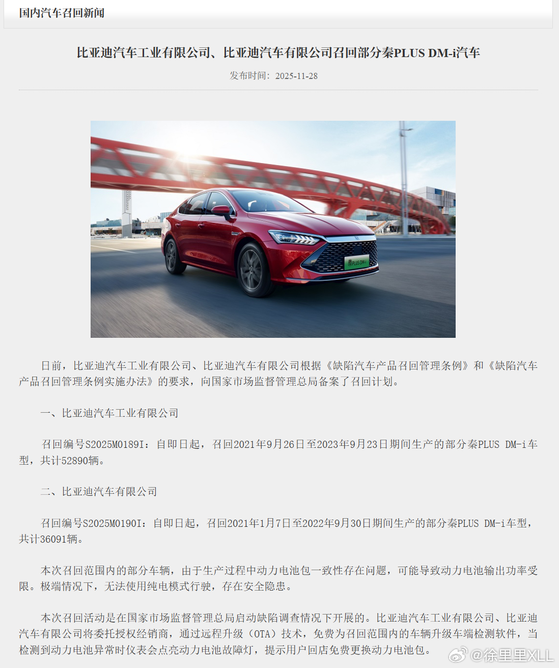 比亚迪召回两个批次共计88981辆秦PLUS DM-i。由于生产过程中动力电池包一致性存在问题,可能导致动力电池输出功率受限。极端情况下,无法使用纯电模式行驶,存在安全隐患。召回编号分别为:S2025M0189I,S2025M0190I。