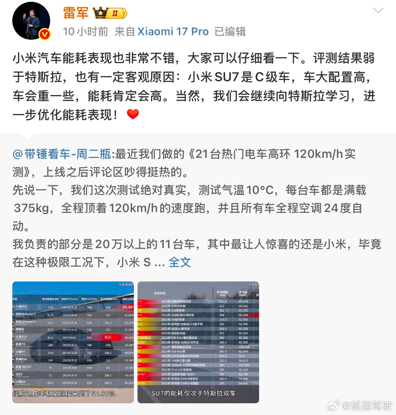 雷军称继续向特斯拉学习挺实在的,SU7能耗比不过特斯拉,直接说车大配置高本身就重,能耗高是客观事儿,还明说要接着跟特斯拉学优化。之前他也夸过特斯拉,说人家FSD牛、涨价都有底气,甚至说小米追上得五到十年。现在小米靠堆电池补差距,但也认了跟特斯拉底层技术有差别。网友有人觉得这是务实,也有人吐槽,但不得不说,敢认差距比硬杠要敞亮多了……