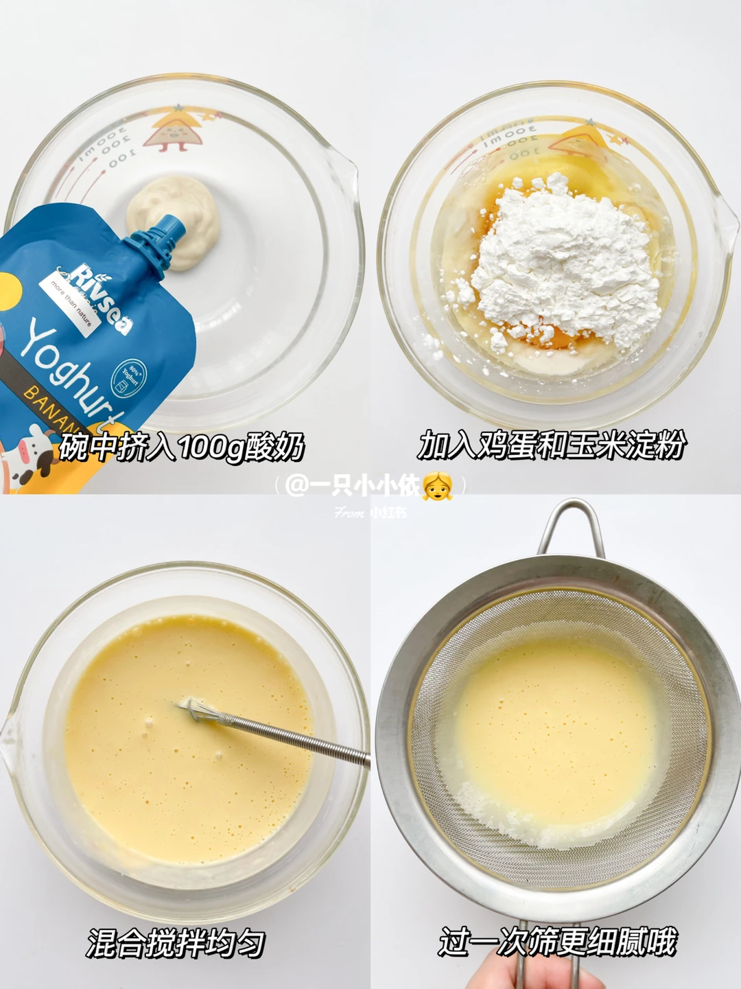 1⃣️碗中挤入100g酸奶,加入鸡蛋和玉米淀粉,混合搅拌匀,过一次筛;