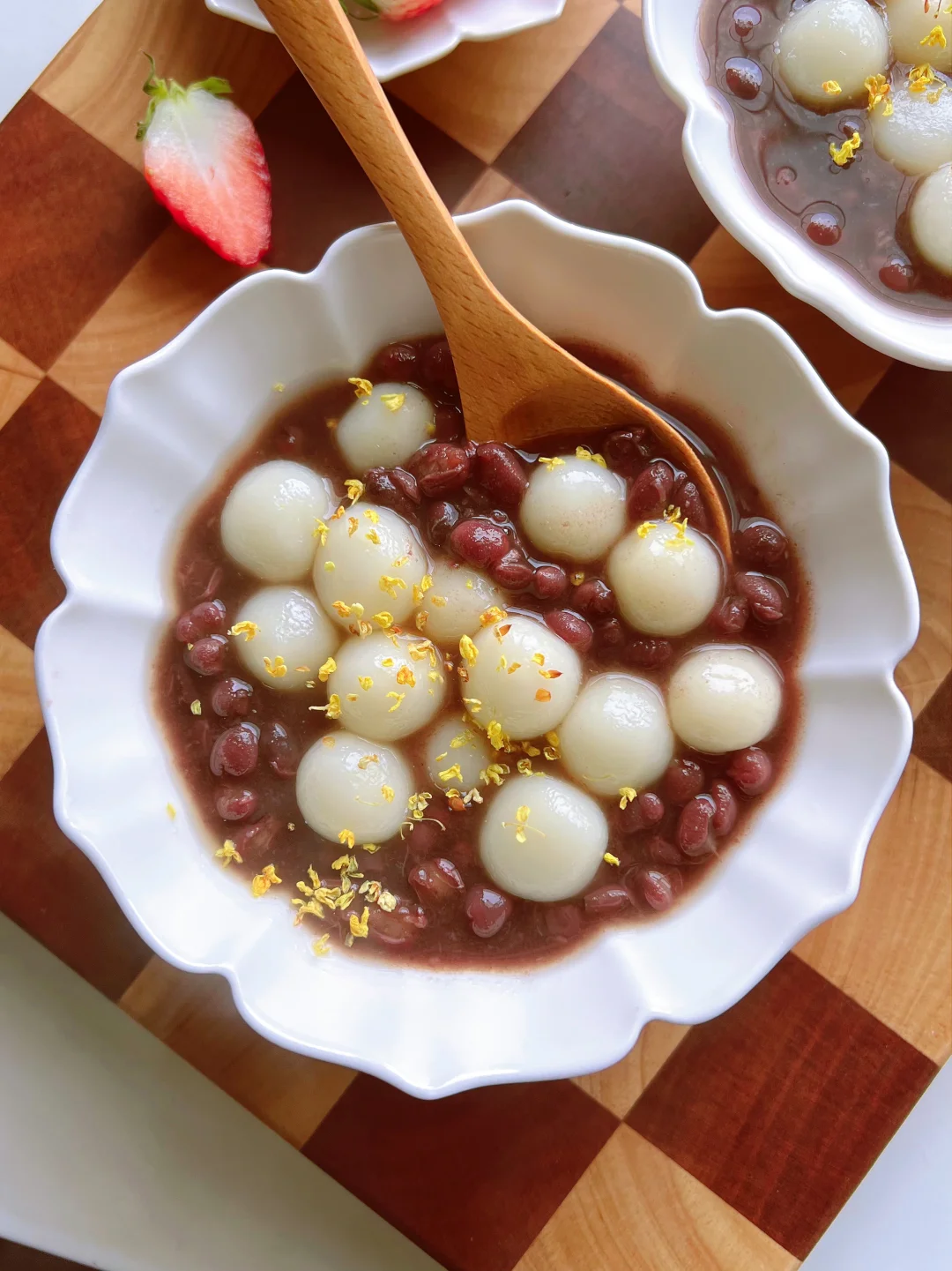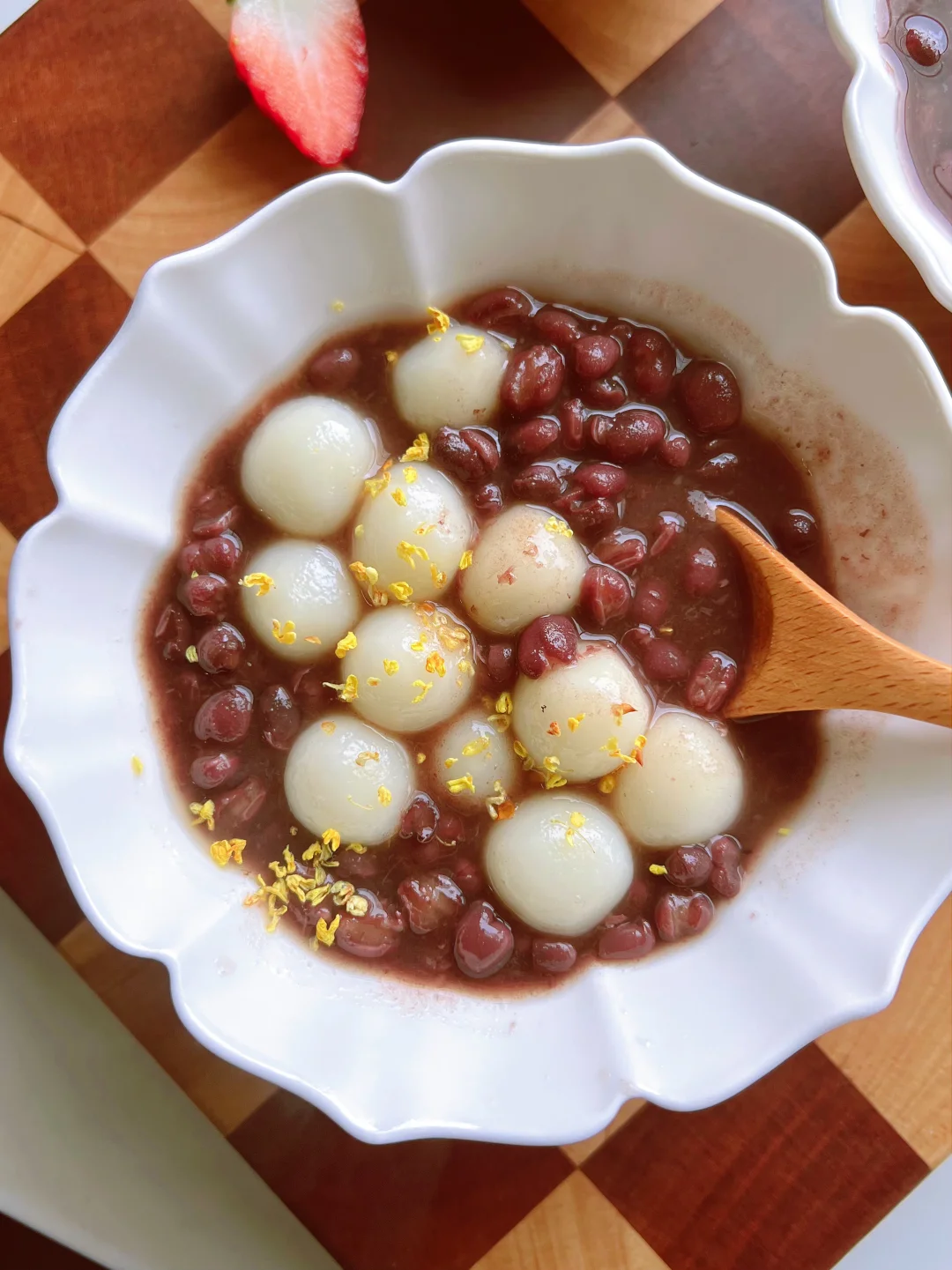 4️⃣红豆汤里加入煮熟的小圆子,撒上桂花就好了,淋一点桂花蜜也是很好吃的