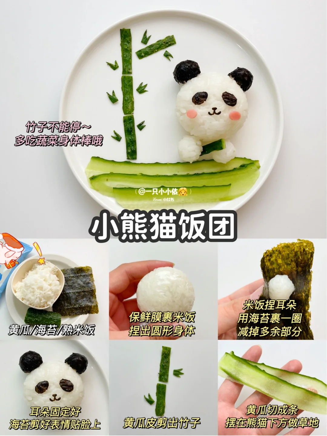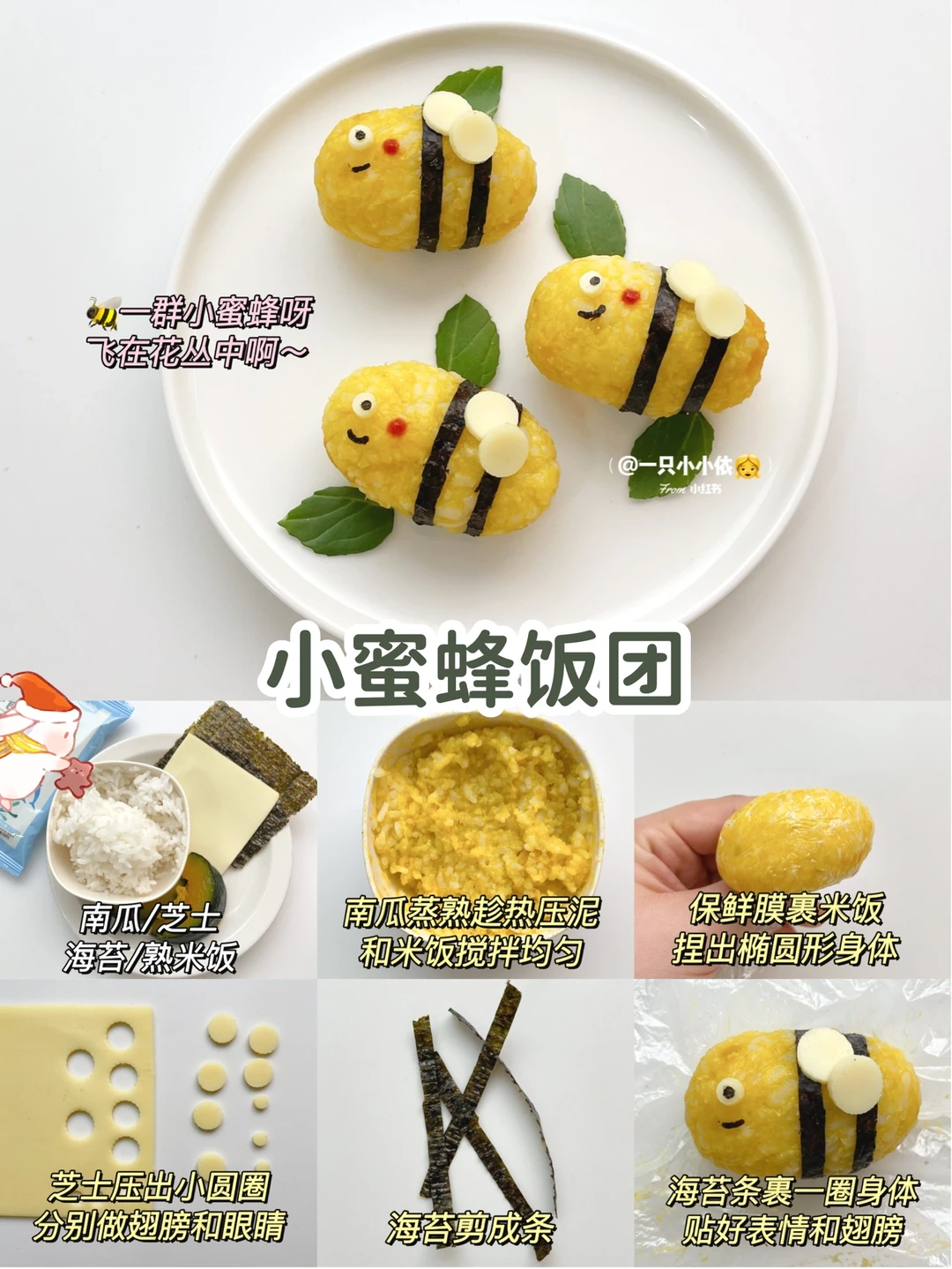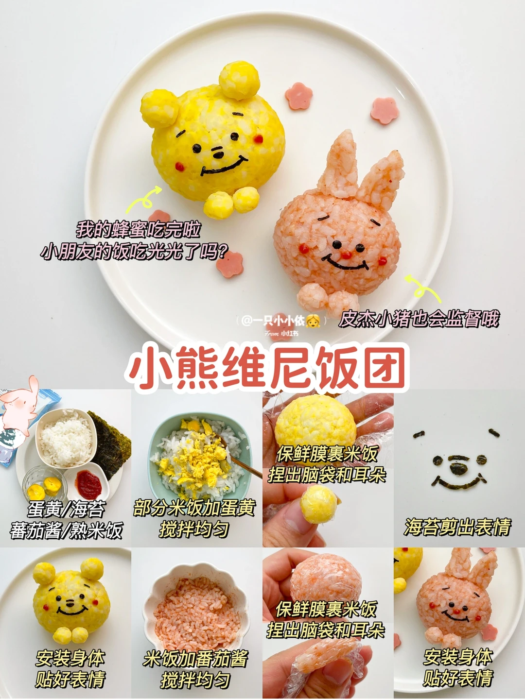 🍭吃可爱长大的卡通饭团来啦!!把可爱萌宠装进餐盘中,和宝宝一起享受干饭乐趣吧🍲 🧚‍♀️当普通米饭变身为各种卡通动物,瞬间就能吸引宝宝进食兴趣,轻松搞定饭渣!做起来也很简单,免模具、超快手,一张保鲜膜就搞定!“魔法妈妈”们一起捏起来吧[斜眼R] · 🌈捏饭团的一点小心得 ✨煮米饭比平时多点水,不要太硬、太干 ✨捏饭团时用保鲜膜裹紧压实,不易散开 ✨提前想好造型,表情、装饰之类的先准备好,等菜炒好了、米✨饭蒸好了,直接放上表情就好 ✨装饰物尽量选宝宝能吃的,表情一般用海苔片剪,耳朵用芝士、火腿,腮红用茄酱、帽子用番茄等 ✨黄色饭团用蛋黄、南瓜调色,红色饭团用番茄酱调色,黑色面团用黑芝麻酱调色 ✨勤加练习会捏的越来越快,我们都是有“魔法”的神奇妈妈 · 🐶玉桂狗饭团 🔹食材:纯海苔片、番茄酱、熟米饭 🔸做法:保鲜膜裹米饭,捏出椭圆形脑袋,再捏出长耳朵、两个小圆球手手;组装好身体各部位;海苔剪表情贴好,番茄酱做腮红✅ · 🐝小蜜蜂饭团 🔹食材:南瓜、芝士、纯海苔片、熟米饭 🔸做法:南瓜蒸熟趁热压泥,和米饭搅拌均匀;保鲜膜裹米饭捏出椭圆形身体;芝士压出小圈圈,分别做翅膀和眼睛;海苔剪成条,裹一圈身体;贴好表情和翅膀✅ · 🎅圣诞老人饭团 🔹食材:番茄、纯海苔片、番茄酱、熟米饭 🔸做法:部分米饭加番茄酱搅拌均匀,保鲜膜裹米饭,捏出三角形身体,再捏出长条做帽沿;番茄皮剪出三角形做圣诞帽;帽子装好,饭团下方粘圈米饭做胡子;海苔剪出表情贴在脸上✅ · 🐻小熊维尼饭团 🔹食材:蛋黄、纯海苔片、番茄酱、熟米饭 🔸做法:部分米饭加蛋黄搅拌均匀;保鲜膜裹米饭,捏出脑袋和耳朵;海苔剪出表情贴好,安装好身体;米饭加番茄酱搅拌均匀。保鲜膜裹米饭,捏出脑袋和耳朵,安装身体,贴好表情✅ · 🐼小熊猫饭团 🔹食材:黄瓜、纯海苔片、熟米饭 🔸做法见图 · 🐔萌鸡饭团 🔹食材及做法见图 · ✨超可爱宝宝花式饭团,双击屏幕随时抄作业哦 ✨本期节目到这里啦,下期见呀! . 宝宝辅食II辅食日记I宝宝辅食分享I宝宝零食I宝宝海苔I宝宝 .