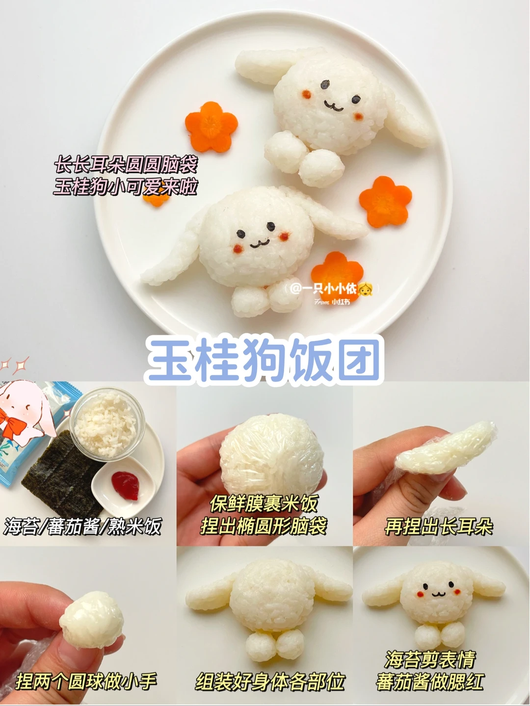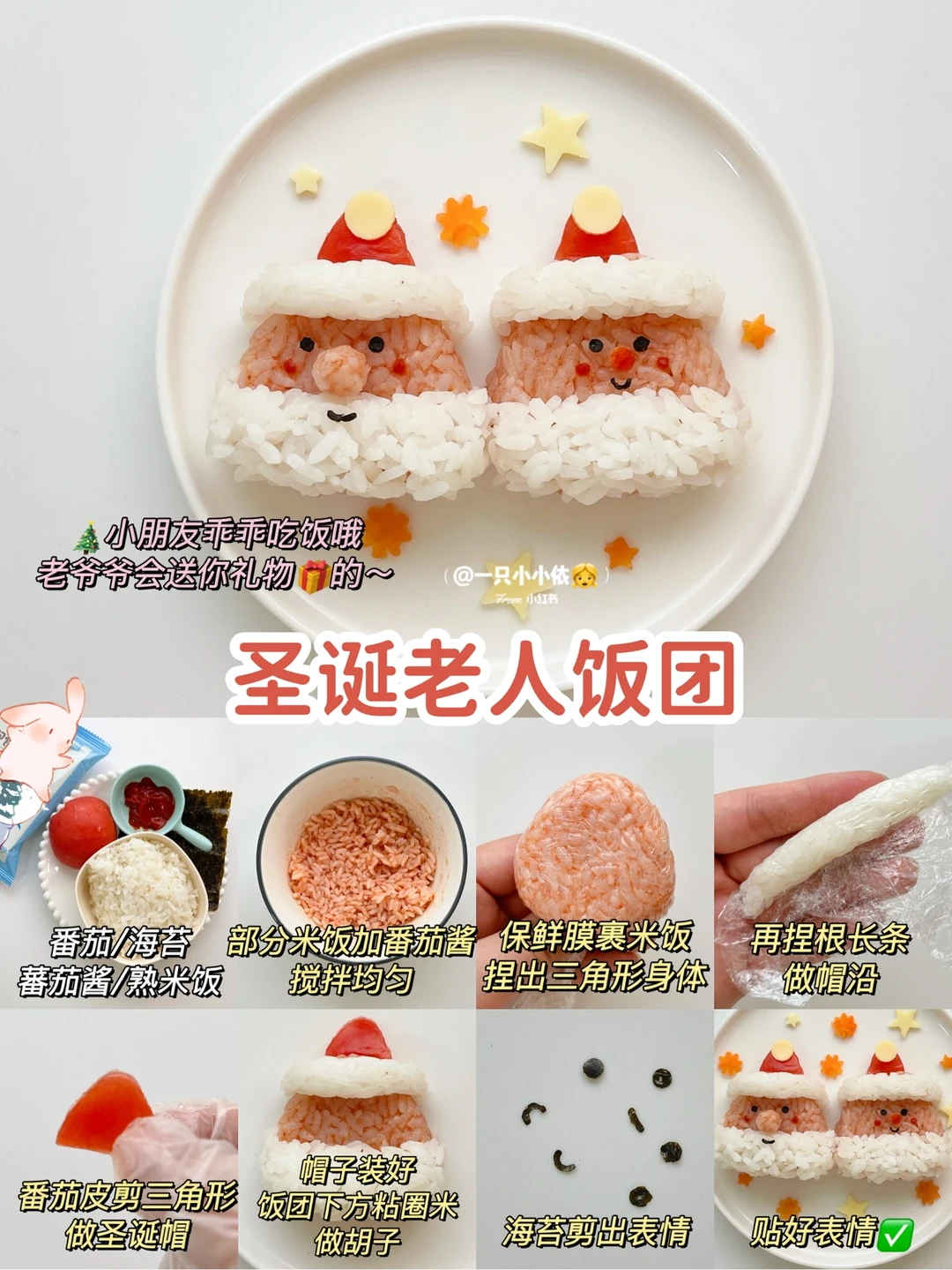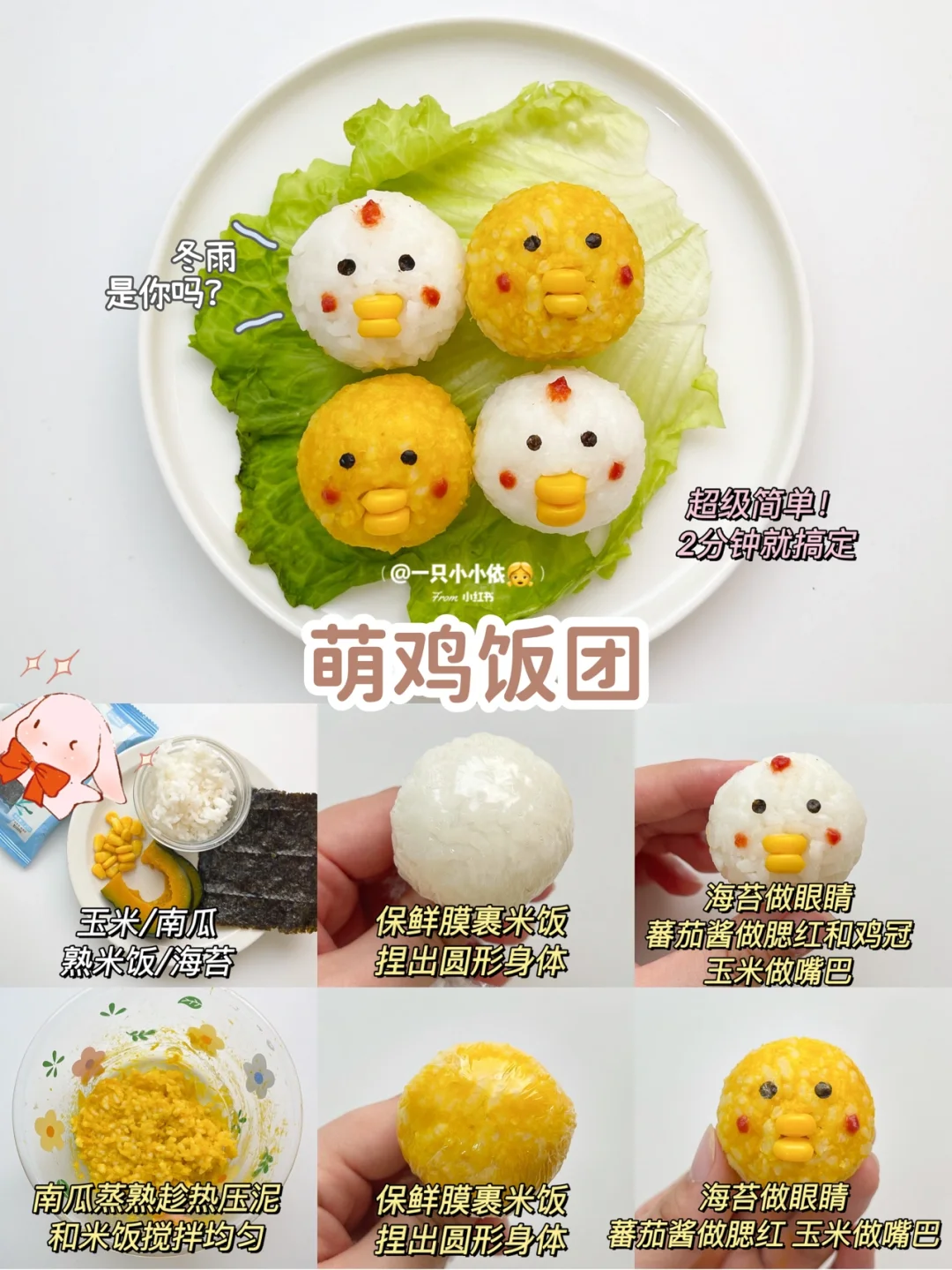🍭吃可爱长大的卡通饭团来啦!!把可爱萌宠装进餐盘中,和宝宝一起享受干饭乐趣吧🍲 🧚‍♀️当普通米饭变身为各种卡通动物,瞬间就能吸引宝宝进食兴趣,轻松搞定饭渣!做起来也很简单,免模具、超快手,一张保鲜膜就搞定!“魔法妈妈”们一起捏起来吧[斜眼R] · 🌈捏饭团的一点小心得 ✨煮米饭比平时多点水,不要太硬、太干 ✨捏饭团时用保鲜膜裹紧压实,不易散开 ✨提前想好造型,表情、装饰之类的先准备好,等菜炒好了、米✨饭蒸好了,直接放上表情就好 ✨装饰物尽量选宝宝能吃的,表情一般用海苔片剪,耳朵用芝士、火腿,腮红用茄酱、帽子用番茄等 ✨黄色饭团用蛋黄、南瓜调色,红色饭团用番茄酱调色,黑色面团用黑芝麻酱调色 ✨勤加练习会捏的越来越快,我们都是有“魔法”的神奇妈妈 · 🐶玉桂狗饭团 🔹食材:纯海苔片、番茄酱、熟米饭 🔸做法:保鲜膜裹米饭,捏出椭圆形脑袋,再捏出长耳朵、两个小圆球手手;组装好身体各部位;海苔剪表情贴好,番茄酱做腮红✅ · 🐝小蜜蜂饭团 🔹食材:南瓜、芝士、纯海苔片、熟米饭 🔸做法:南瓜蒸熟趁热压泥,和米饭搅拌均匀;保鲜膜裹米饭捏出椭圆形身体;芝士压出小圈圈,分别做翅膀和眼睛;海苔剪成条,裹一圈身体;贴好表情和翅膀✅ · 🎅圣诞老人饭团 🔹食材:番茄、纯海苔片、番茄酱、熟米饭 🔸做法:部分米饭加番茄酱搅拌均匀,保鲜膜裹米饭,捏出三角形身体,再捏出长条做帽沿;番茄皮剪出三角形做圣诞帽;帽子装好,饭团下方粘圈米饭做胡子;海苔剪出表情贴在脸上✅ · 🐻小熊维尼饭团 🔹食材:蛋黄、纯海苔片、番茄酱、熟米饭 🔸做法:部分米饭加蛋黄搅拌均匀;保鲜膜裹米饭,捏出脑袋和耳朵;海苔剪出表情贴好,安装好身体;米饭加番茄酱搅拌均匀。保鲜膜裹米饭,捏出脑袋和耳朵,安装身体,贴好表情✅ · 🐼小熊猫饭团 🔹食材:黄瓜、纯海苔片、熟米饭 🔸做法见图 · 🐔萌鸡饭团 🔹食材及做法见图 · ✨超可爱宝宝花式饭团,双击屏幕随时抄作业哦 ✨本期节目到这里啦,下期见呀! . 宝宝辅食II辅食日记I宝宝辅食分享I宝宝零食I宝宝海苔I宝宝 .