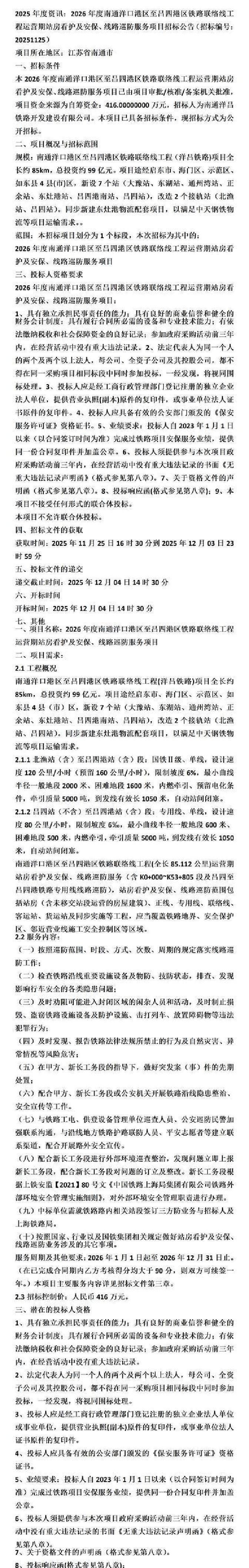 南通沿海这条85公里的洋吕铁路,自2023年底通车后,货运量直线上升,今年前三季度已超过去年同期20%,直接拉动当地钢铁和化工出口大增。这条线从洋口港直通吕四港,串起启东、海门等四个区县,7个新站像脉络一样注入活力,总投资99亿的“大动脉”正忙着吞吐万吨货物。 最近,铁路公司抛出重磅招标:2026年运营期站房看护、安保和线路巡防服务,全包式外包,预算控制在合理区间,优先挑那些有铁道安保经验的靠谱企业。服务范围覆盖全线站房日常守护、24小时监控巡逻,还有应急响应机制,确保一草一木都安全无虞。截止投标时间定在下月,门槛不高但要求严:得有独立法人资格、类似项目不少于两年履约记录,还需配齐专业巡防队。 这招标来得及时!随着长三角铁水联运加速,洋吕铁路明年预计货运吞吐破亿吨,安全巡防就是底线保障。选对合作伙伴,不光防风险,还能优化运营效率,推动南通港区从“过路港”变身“枢纽港”。在我这步棋下得稳,未来几年,这里货运周转量至少翻番,周边产业园就业岗位多出上万。铁路兴,经济旺,谁抢到这单,谁就抓住了沿海开发的“安全阀”。