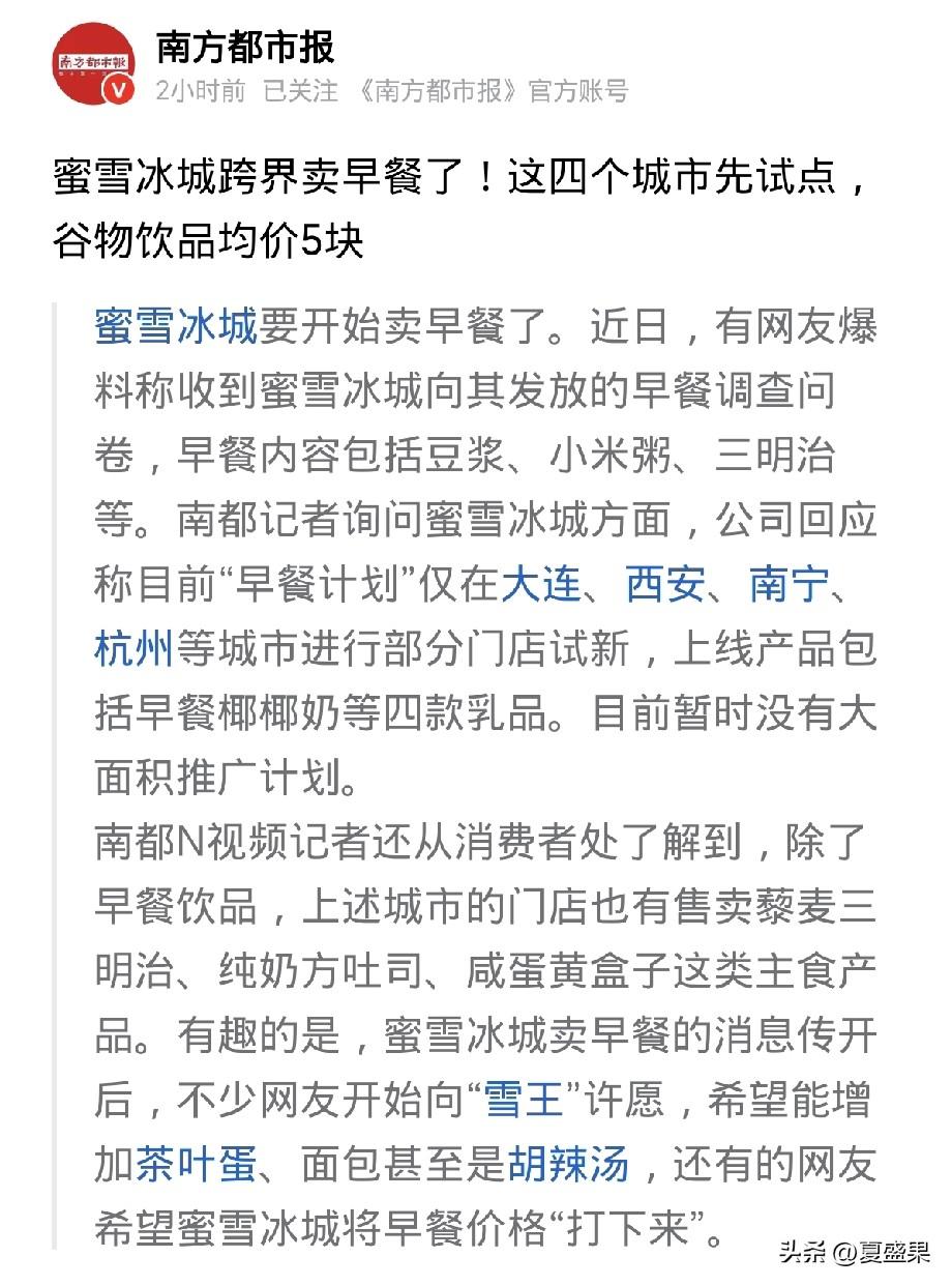 欢迎蜜雪冰城卖早餐。 最近蜜雪冰城在大连、西安、杭州、南宁等城市尝试卖早餐, 价格亲民,真材实料,是蜜雪冰城受人喜欢的原因。 蜜雪冰城曾经成功进军啤酒,现在进军早餐,建议还可以出售面包蛋糕。 把价格打下来,把质量提上去, 薄利多销,不仅遍及全国大城市,还深耕县乡镇,开一家火一家,到现在已经5万多家分店了。