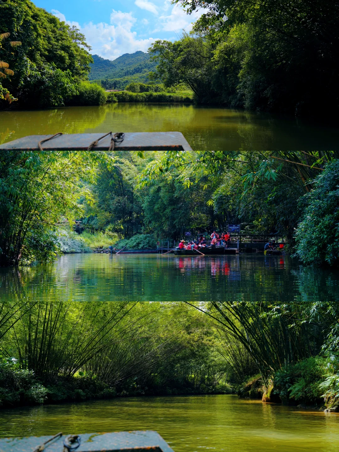 乘船游览分为2段,第一段有点儿泛舟桂林山水的感觉,青山绿水、竹林环绕,很是惬意
