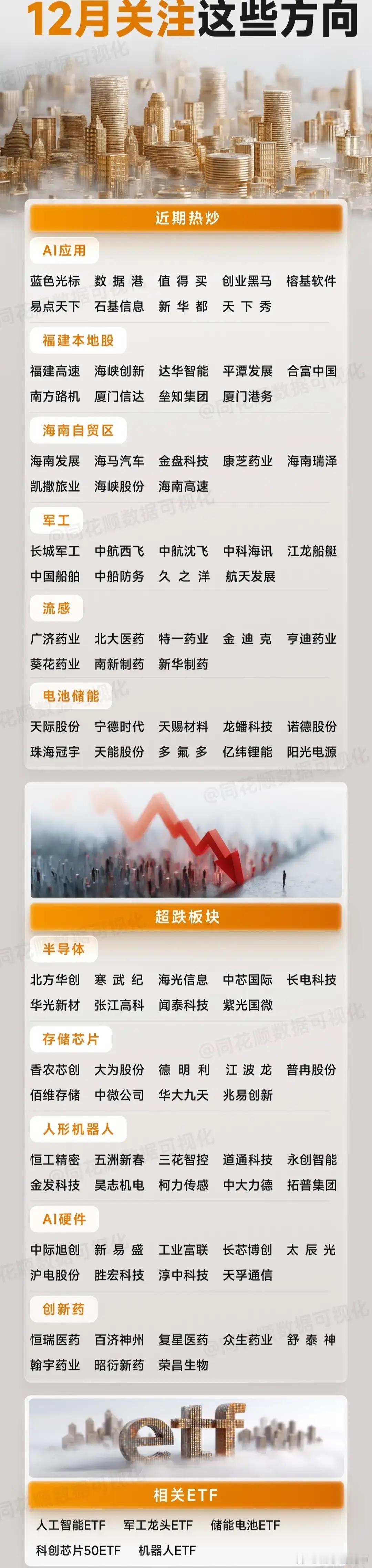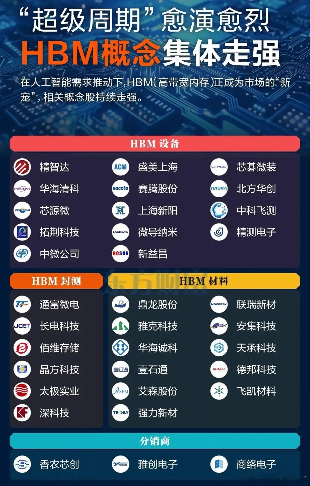 围绕不同投资主题展开,分别聚焦12月投资方向、低轨卫星概念及HBM概念的市场动态与企业信息。第一张图以“12月关注这些方向”为核心,通过三大区块梳理投资线索。其中“近期热炒”板块涵盖AI应用、福建本地股、海南自贸区、军工、流感、电池储能等领域,列出蓝色光标、福建高速、海南发展、长城军工、广济药业、宁德时代等具体个股;“超跌板块”聚焦半导体、存储芯片、人形机器人、AI硬件、创新药等调整较深的行业,涉及北方华创、香农芯创、恒工精密、中际旭创、恒瑞医药等标的;“相关ETF”则推荐了人工智能ETF、军工龙头ETF、储能电池ETF、科创芯片50ETF、机器人ETF等跟踪对应板块的工具。第二张图聚焦“算力搬上太空?低轨卫星概念爆发”热点,背景为深蓝星空与数据流动效果。受北京布局太空数据中心带动,低轨卫星板块走强,乾照光电涨停,天银机电、中国卫星表现强势。内容按产业链环节划分,包括太空计算卫星、太阳翼及能源系统、测试服务(广电计量、西测测试)、卫星总装运营(中科星图、星图测控、航天环宇、中国卫星、航天智装、海格通信、中国卫通、上海沪工、国博电子)、火箭(航天动力、臻镭科技、信科移动、超捷股份、*ST铖昌、佳缘科技、天银机电、上海瀚讯)、卫星载荷及元器件(高华科技、复旦微电、航天电器、九丰能源、智明达、陕西华达)等板块,逐一列出各环节相关企业。第三张图主题为“‘超级周期’愈演愈烈,HBM概念集体走强”,背景为蓝色电路板图案。在人工智能需求驱动下,HBM(高带宽内存)成市场“新宠”,相关概念股持续走强。内容按细分领域分类:HBM设备类有精智达、盛美上海、芯碁微装、华海清科、赛腾股份、北方华创、芯源微、上海新阳、中科飞测、拓荆科技、微导纳米、精测电子、中微公司、新益昌等;HBM封测类包括通富微电、长电科技、佰维存储、晶方科技、太极实业、深科技等;HBM材料类涉及联瑞新材、雅克股份、安集科技、华海诚科、天承科技、壹石通、德邦科技、艾森股份、飞凯材料、强力新材等;分销商类则有香农芯创、雅创电子、商络电子等。