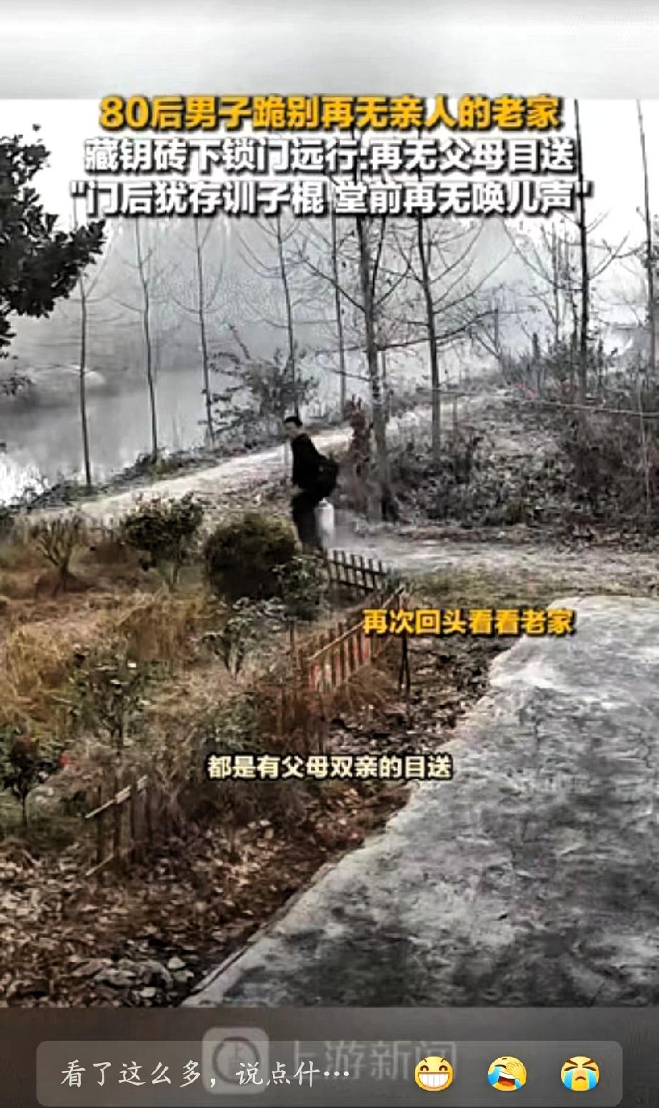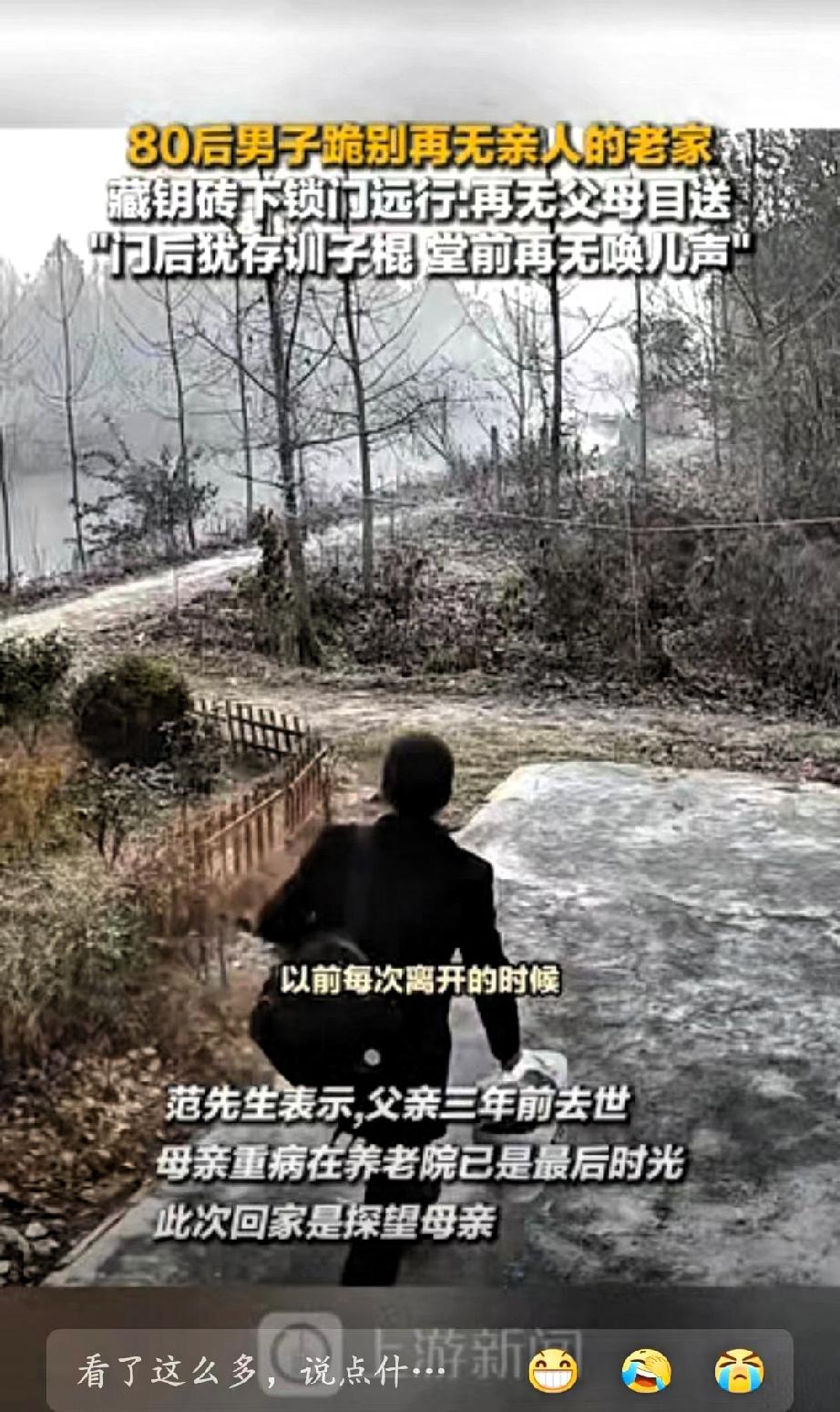 泪目了!江苏苏州,一80后男子父亲去世,母亲时日不多,来到老宅,面朝着大门跪地三叩首 把钥匙小心翼翼藏进门口砖头下,一步三回头的背影在夕阳下拉得很长,藏着世间最痛的离别——父母不在,老家就真的成了只可回望的故乡。 多少人在这一幕里看到了自己的影子?我们总在为生活奔波,挤地铁、赶项目,以为老家永远会在原地等候,以为父母的唠叨会伴随一生。 可时光从不会手下留情,范先生的父亲三年前离世,母亲重病缠身躺在养老院时日无多,曾经充满欢声笑语的老宅,如今只剩满院寂静,那些熟悉的烟火气,终究成了回忆里的风景。 还记得小时候,每次离家求学或外出打工,父母总会站在门口目送我们远去,手里攥着打包好的土特产,千叮咛万嘱咐要照顾好自己,直到我们的身影消失在拐角才舍得转身。 那时的我们总嫌唠叨,迫不及待想要奔赴远方,去追逐所谓的梦想,却不懂那目送的眼神里,藏着父母最深沉的牵挂与不舍。如今,再想听听那些唠叨,再想看看门口的目送,却再也没有机会。 这把锁锁上的不只是老宅的门,更是我们再也回不去的童年,和那份肆无忌惮的依赖。所谓故乡,从来不是一栋冰冷的房子,而是有父母等待的温暖港湾。父母在,我们永远是被宠爱的孩子;父母去,我们只能被迫长大,独自面对世间的风雨与沧桑。 亲情从来都是一场倒计时,没有人能预料明天和意外哪个先来。别等“堂前再无唤儿声”才追悔莫及,趁现在还有机会,多抱抱爸妈,多回趟家,陪他们吃一顿热饭,聊一聊家常。那些看似平凡的日常,在时光的沉淀中,都会成为日后最珍贵的念想。