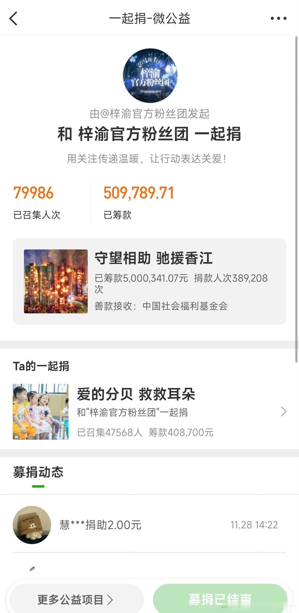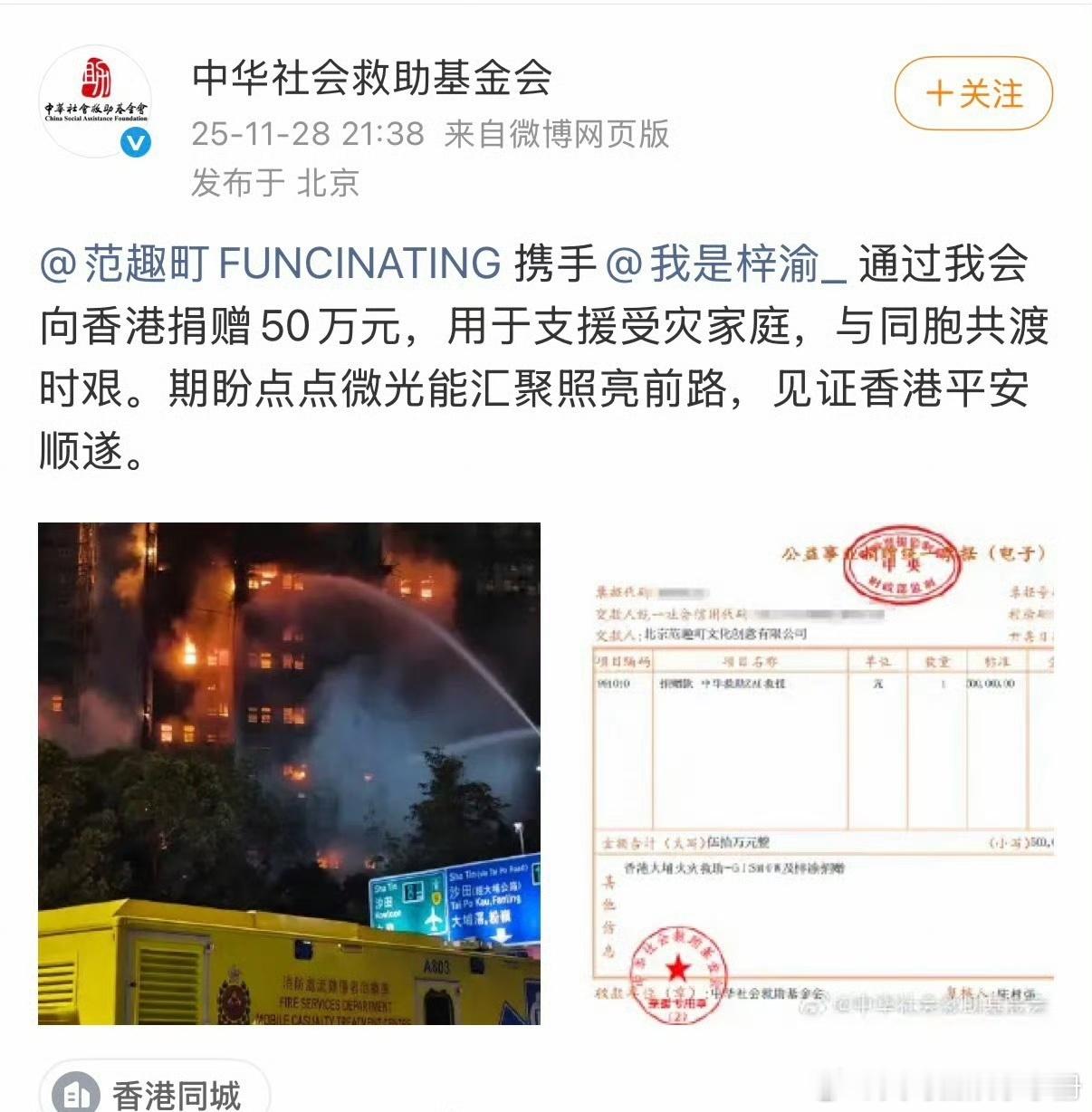 范趣町携手梓渝向香港捐赠50万,梓渝粉丝也捐赠50w+明星捐款梓渝向香港捐款50万元