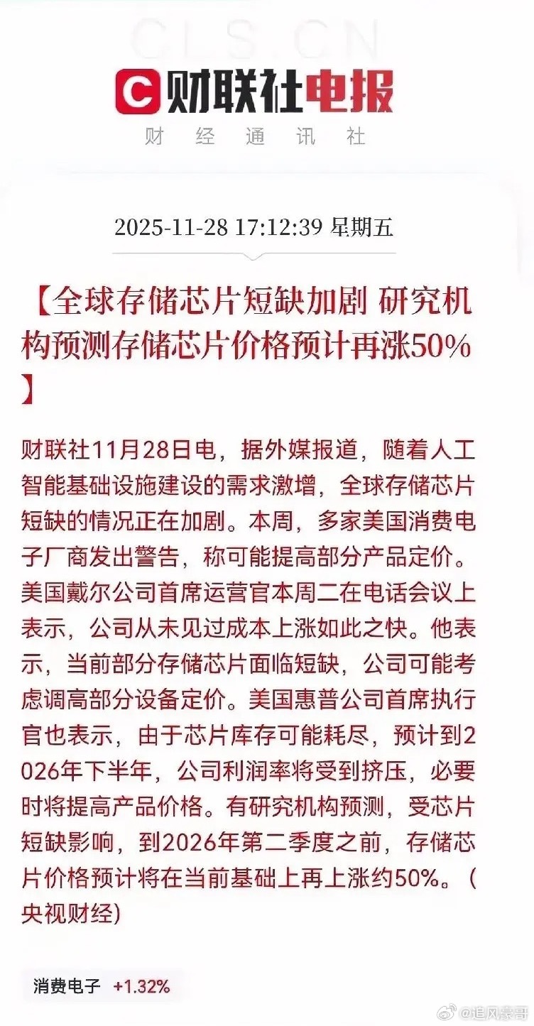 利好总是在盘后,这一板块迎来利好催化!AI基建需求激增推动全球存储芯片短缺加剧,戴尔、惠普等消费电子厂商因芯片库存紧张,计划提高产品定价;研究机构预测,到2026年第二季度前,存储芯片价格将在当前基础上再涨约50%。这一趋势下,存储芯片全产业链相关企业将直接受益于产品涨价与订单增长。1. 兆易创新国产存储设计龙头,NOR Flash全球市占率18.5%,车规级产品覆盖特斯拉、比亚迪,利基型DRAM受益缺货涨价,2025Q3扣非净利润同比增超60%;自研LPDDR5切入华为昇腾供应链,直接承接AI存储需求红利。2. 澜起科技全球内存接口芯片龙头,DDR5产品市占率超40%,HBM3存储控制器通过验证,AI服务器配套订单增250%;2025前三季净利润增66.89%,毛利率62%,受益数据中心存储架构升级。3. 江波龙第三方存储模组龙头,Lexar品牌全球市占率第二,自研主控芯片部署破1亿颗,UFS4.1获国际原厂认可;2025Q3单季营收增54.6%,企业级存储订单增666%,AI服务器方案已量产。4. 长电科技国内封测龙头,掌握HBM封装核心工艺,独家承接SK海力士HBM3E订单;2025封测收入预计增超30%,为长江存储、华为提供高端存储封测,AI服务器订单激增。5. 佰维存储全链条存储企业,ePOP产品供货Meta AI眼镜,企业级SSD订单增200%;2025Q2存储营收占92%,自研PCIe Gen5主控,惠州封测基地扩产,AI服务器CXL产品待规模放量。6. 深科技国内最大存储封测商,沛顿科技承接长江存储、长鑫超50%委外封测;2025Q3封测营收增63%,产能利用率超110%,AI服务器存储测试订单增150%,紧跟下游扩产节奏。7. 北方华创半导体设备平台型企业,刻蚀机、PECVD覆盖3D NAND/DRAM产线,是长江存储、长鑫核心供应商;2025上半年存储设备收入增72%,12英寸TSV刻蚀机打破海外垄断,受益存储扩产。8. 中微公司刻蚀设备龙头,长江存储供应链占比超40%,232层3D NAND刻蚀设备缺陷率低于国际竞品;2025Q1新签20台订单,Preforma设备填补国内空白,HBM刻蚀需求激增带动业绩。9. 北京君正车载DRAM全球市占率19%,收购ISSI后适配特斯拉FSD、英伟达Orin平台;3D DRAM样品2025交付,存算一体芯片X2000导入DeepSeek服务器,2025车载存储营收增超30%。10. 东芯股份国内SLC NAND龙头,产品覆盖消费、车规领域,车载订单增120%;持有砺算科技股权布局GPU,自研PCIe Gen5主控对标国际,2025Q2存储营收增90%,受益AI端侧设备。11. 通富微电存储封测规模A股第二,覆盖HBM、3D NAND,2025Q2存储封测收入增75%;是AMD、英伟达HBM封装供应商,订单能见度至2026Q1,毛利率升至28%,二季度净利润环比增206%。12. 拓荆科技国内唯一量产PECVD企业,薄膜沉积设备市占率超25%,是长江存储3D NAND核心供应商;2025Q2营收增70%,PECVD订单翻倍,混合键合技术参与HBM研发,替代东京电子产品。13. 香农芯创SK海力士HBM3独家代理商,绑定阿里、腾讯云厂商;2025Q1营收增243%,自主品牌DDR5通过浪潮认证,存算一体芯片年底量产,受益AI服务器分销。14. 普冉股份全球NOR Flash市占率4%、EEPROM市占率6%,40nm工艺领先;拟收购SHM补全NAND布局,2025Q2光刻胶订单占长江存储、长鑫70%,打破日本垄断,受益存储材料国产替代。15. 华海诚科国内唯一量产12英寸晶圆级EMC企业,存储封装材料市占率超80%;2025Q2营收增70%,混合键合技术参与HBM研发,设备国产化超50%,HBM堆叠需求带动业绩。16. 德明利国内存储卡市占率6.73%,主控芯片适配多原厂晶圆,2024净利润增13倍;量产DDR5 RDIMM企业级产品,2025Q2存储营收增90%,自研PCIe Gen5主控支持NVMe 2.0。