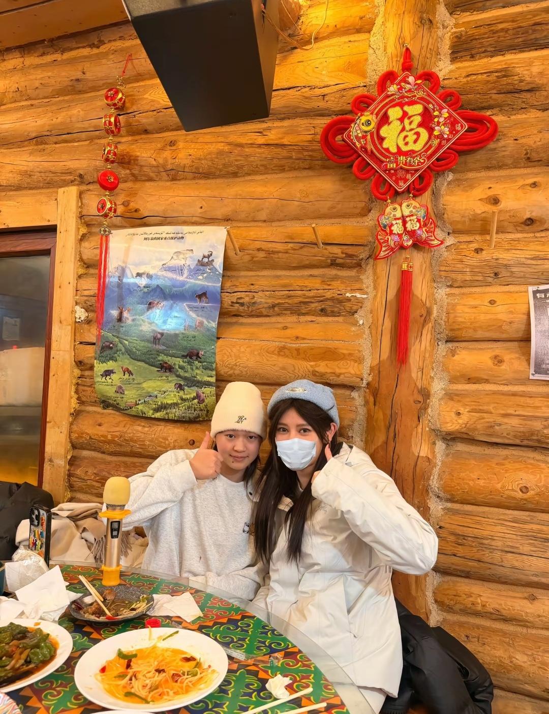 全红婵在新疆除了滑雪外,也吃了这里的美食,朋友们热情接待她,她在雪场的民宿木屋吃饭的场景看起来挺温馨。 这个小木屋里可以唱歌,全红婵吃饭的位置上摆放了话筒,从吃饭的圆桌上来看,吃的也很简单,有土豆丝、辣椒炒肉,都是非常家常的菜,没有大鱼大肉。 全红婵与朋友吃饭拍的合照也很可爱,这次休息也是好好玩了几天,相信这也是难忘的时光。