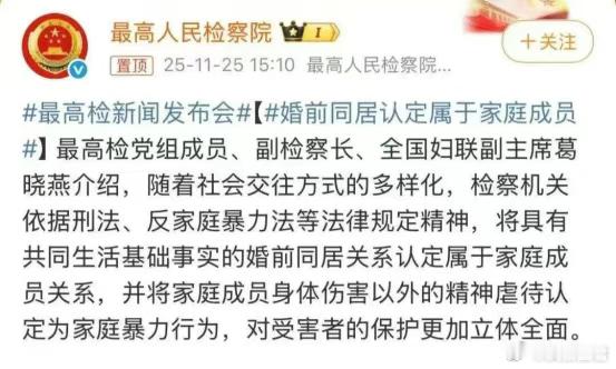 “婚前同居属于家庭成员”,热搜炸了!今天最大的新闻,当属最高检的一则通报——“婚前同居关系属于家庭成员关系”。 这个听起来有些拗口的法律认定,瞬间冲上热搜第一,引爆了全网讨论。为啥?因为不管男人还是女人,都觉得自己吃亏了。 男人们想,“同居就算家人,那分手是不是还要分她一半财产?”女人们担心,“如果他对我动手,本来可以认定故意伤害的,成了家人就只能算是家暴了。这不是在变相纵容暴力吗?” 更现实的问题是:什么叫“稳定共同生活”?其中确认的边界在哪里?同居一周算吗?一个月呢?难道要靠法官的心情来决定? 还有一个更极端但很现实的问题:既然都是家人了,那如果我同居期间重病,生活不能自理,对方要分手,这算遗弃罪吗?  以上,法律都还没有给出答案。但不得不说,这些担忧都有道理。法律不能只有一个大方向,还需要明确的细则。否则,善良的人不敢恋爱,恶劣的人钻法律空子,这就违背了保护的初衷。 那么,最高检为何突然提出这个新概念呢?这就不得不说说苗某与马某某同居死亡案了。 2021年12月,年轻女子苗某和马某某成为恋人,像所有热恋中的情侣一样,他们租房同居,见对方父母,计划着未来。 从2022年1月开始,马某某露出了真面目。他以“没有安全感”为借口,要求苗某删除所有异性微信、不准出差、随时报备行踪。 更可怕的是,他持续不断地辱骂、贬低、污蔑苗某——这不是拳打脚踢的家暴,而是杀人不见血的精神凌迟。 2022年4月,仅仅因为苗某要出国进修,马某某就疯狂辱骂她数小时,苗某第一次吞药自杀,被救回。同年8月,苗某发现马某某出轨,她再次吞药,再次被救回。 2022年12月10日晚上,苗某参加了同学聚会。马某某在酒吧喝酒时发现了,开始通过微信进行长达数小时的辱骂“轰炸”。 凌晨三点,苗某吞下了准备好的药物。这一次,她没有再醒来。苗某不知道,她的死亡将会改变法律,并引发一场全民关注的舆论风暴。 苗某死后,办案检察官面临一个难题:因为并没有实际动手殴打,所以根本没办法认定马某某“故意伤害”的罪责。 那么,他们不是夫妻,只是同居情侣,马某某的行为能构成虐待罪吗?要知道,虐待罪只适用于“家庭成员”。如果认定失败,马某某很可能只会受到轻微的行政处罚,苗某就白死了。 权衡之下,检察官们选择了突破。他们指出,两人租房同居近一年,见了家长、有结婚计划、经济上相互扶持——这已经形成了“事实上的家庭关系”。 最终,马某某被以虐待罪判处有期徒刑三年两个月。这个判决,打破了法律对“家庭”的传统认知。最高检在发布会上明确表示:具有共同生活事实的婚前同居关系,属于家庭成员关系。 搞清楚这个新法律认定的来龙去脉,多少也就能够理解检察官的良苦用心了——时代变了,而法律必须跟上我们的生活。 想想看,现在有多少情侣在结婚前就同居了?有多少人把同居对象当作此生挚爱?如果法律只保护那一纸结婚证,而对这些真实存在的亲密关系视而不见,那才是最大的不公。 更重要的是,家庭暴力从来不只是拳打脚踢。精神虐待、经济控制、情感操纵——这些看不见的暴力,往往比身体暴力更致命。 苗某的案例就是最好的证明:马某某没有打过她一次,却用言语把她逼上了绝路。比较典型的还有北大包丽案,其男友牟林翰也是以虐待罪判处有期徒刑三年二个月。 判断关系的形式远不如保护关系中的人的尊严重要。从这些具体案例中,我们看到,法律正在努力跟上社会变化的步伐,试图保护那些需要保护的人。 任何关系都不应成为暴力的庇护所,任何承诺都不应包含伤害的权利,这或许才是这一法律认定最核心的价值导向。 不过,咱们也必须承认一个客观事实,即法律需要更加精细化的设计—— 一个好的初衷,必须有配套的细则支撑,否则就不是在解决问题,而是在创造问题。