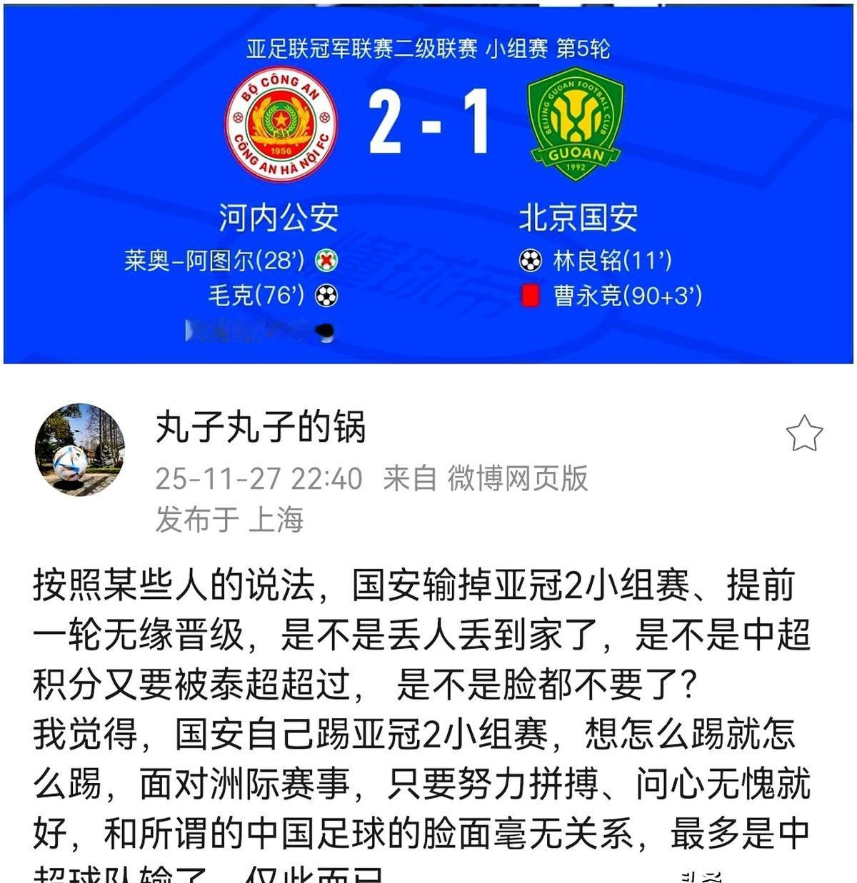 输球就输球,别扯什么“拼了就好,问心无愧”。 我就纳了闷了,这年头“问心无愧”这四个字,门槛这么低了吗? 机会来了,一脚踢天上去。领先了,守也守不住。最后眼看要输了,脾气上来了,直接跟人干仗。 场上一个个踢得跟大爷遛弯似的,散漫,无所谓。 这就是所谓的“努力拼搏”? 别逗了。 这不叫输球,这叫丢人。 还有人说,别动不动就上升到中国足球的脸面,这只是一家中超俱乐部输了而已。 是吗? 你去问问那些半夜守着看球的球迷,是不是“而已”? 身上穿着那件印着北京的球衣,站在亚洲赛场上,你跟我说你只代表你自己? 真的,有时候最可怕的不是输。 是输习惯了。 是输得心安理得,输得理直气壮,还能反过来教育球迷要平常心。 问心无愧就好。 嗯。 可问题是,心呢?
