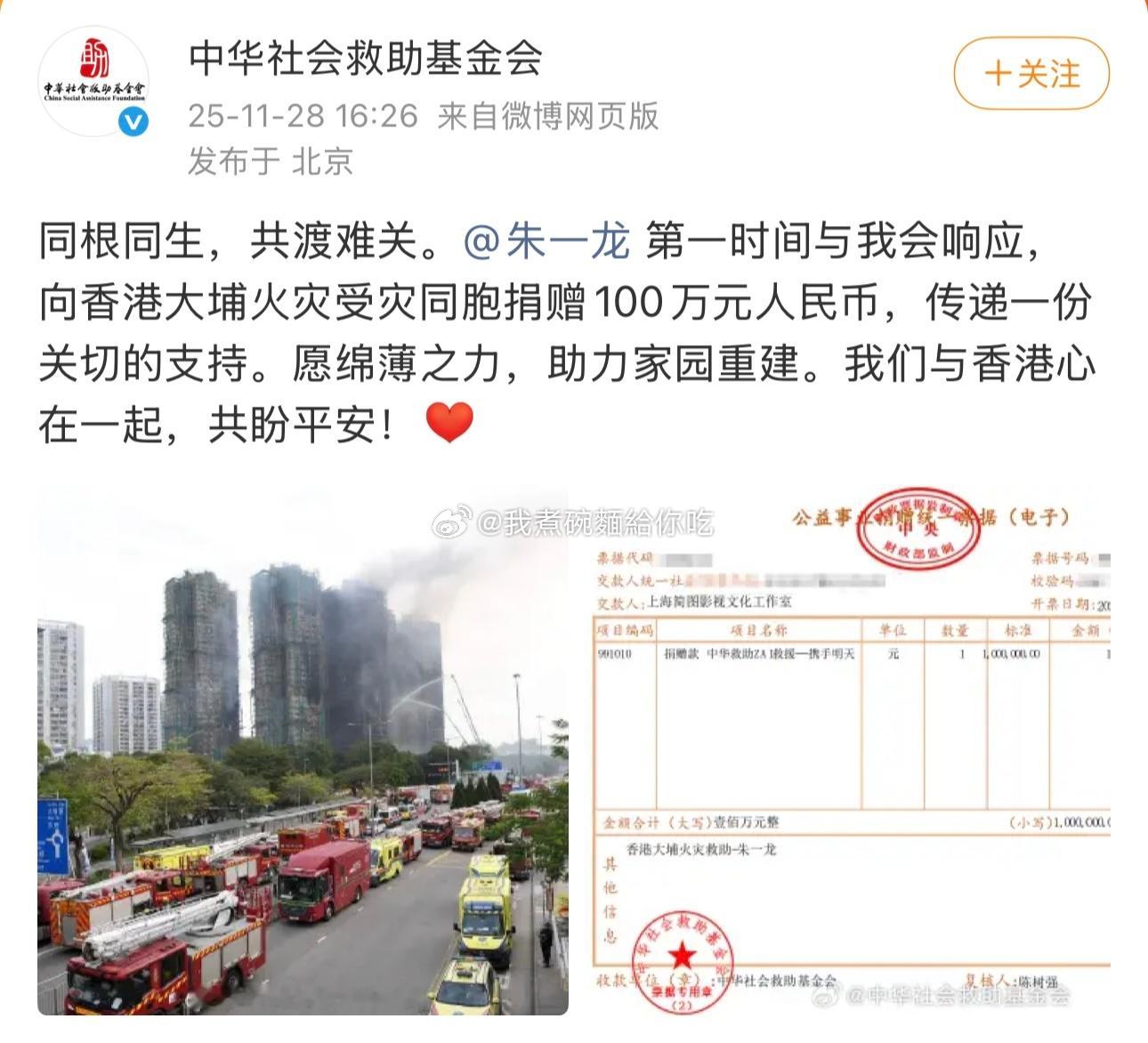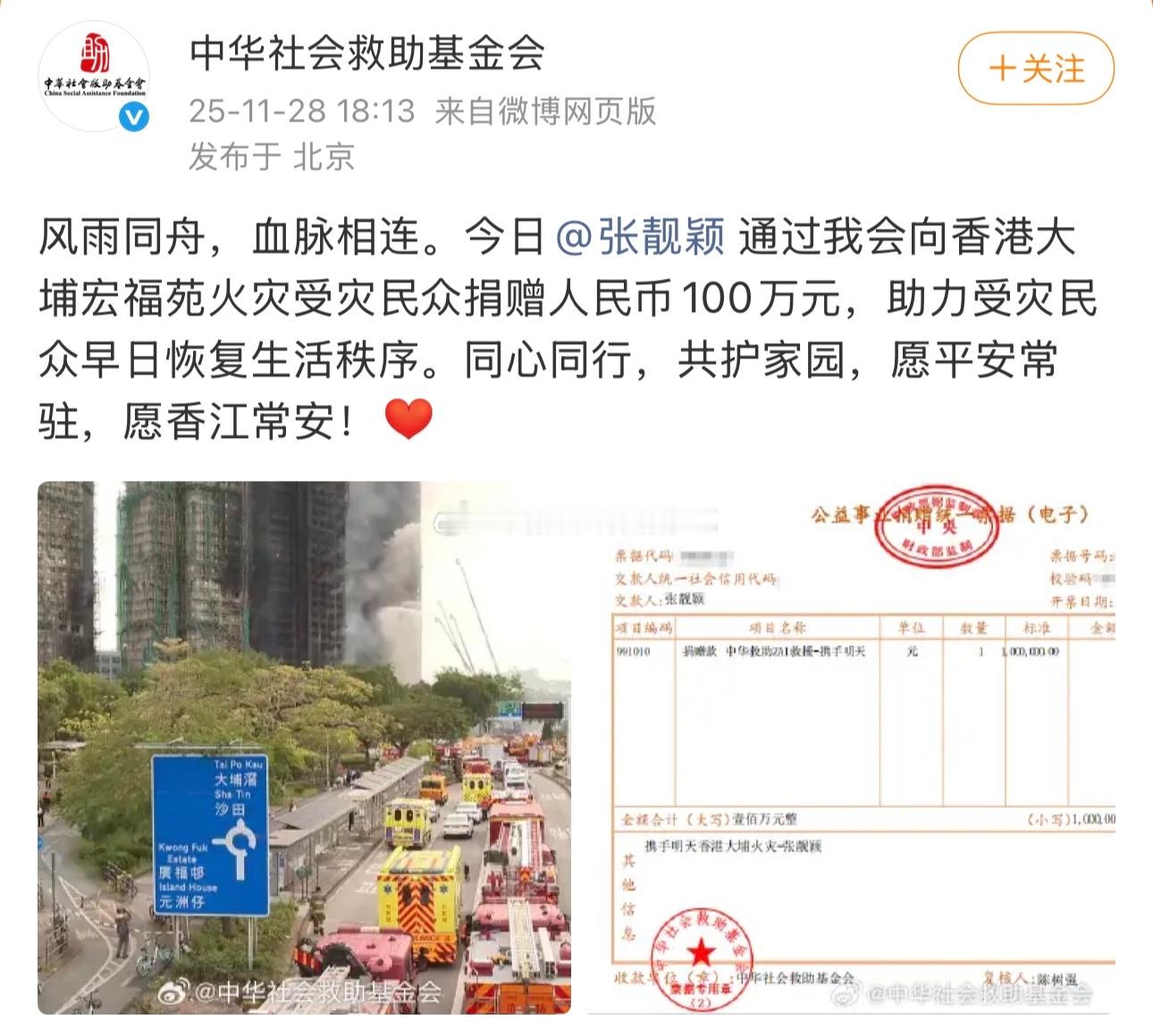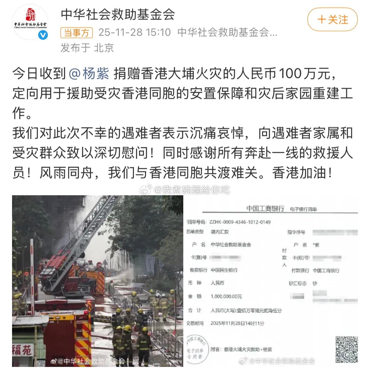 内地多位明星捐款支援香港大埔火灾救援.肖战、易烊千玺、朱一龙、王一博、张杰谢娜夫妇、吴磊、林俊杰、张靓颖、杨紫、周深、张艺兴、李荣浩杨丞琳夫妇、王源、华晨宇、单依纯、胡歌、黄晓明等