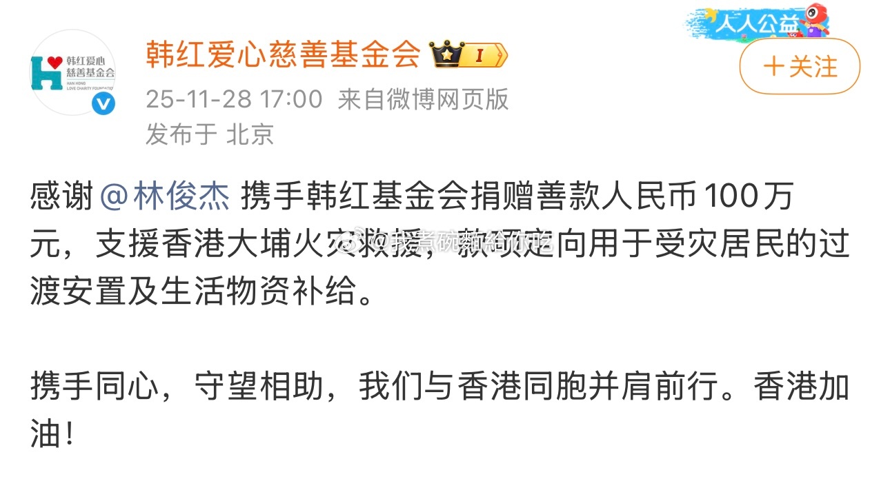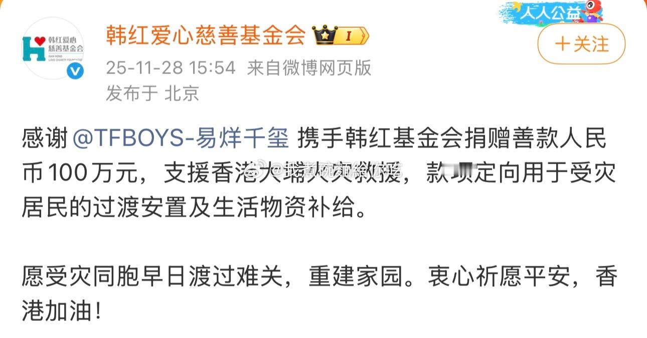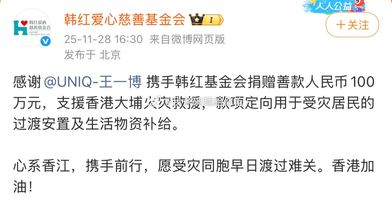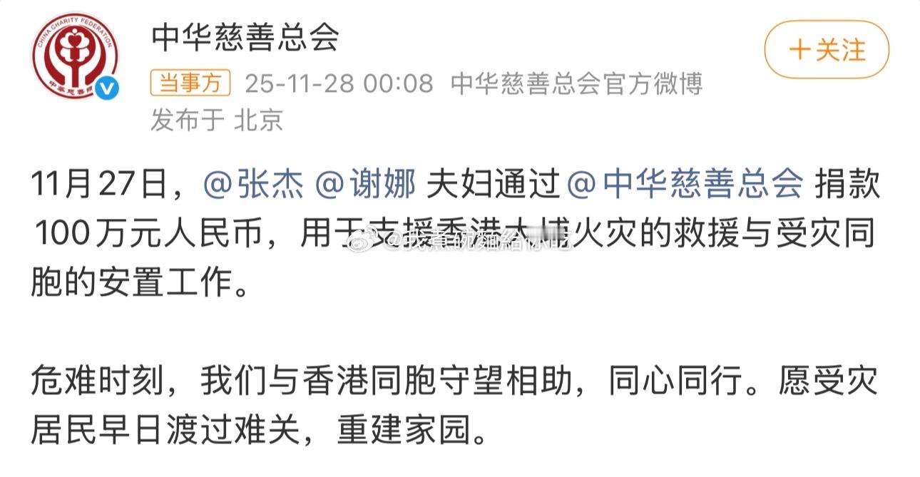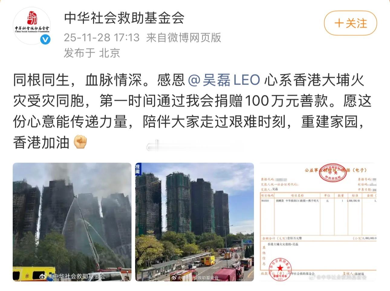 内地多位明星捐款支援香港大埔火灾救援.肖战、易烊千玺、朱一龙、王一博、张杰谢娜夫妇、吴磊、林俊杰、张靓颖、杨紫、周深、张艺兴、李荣浩杨丞琳夫妇、王源、华晨宇、单依纯、胡歌、黄晓明等