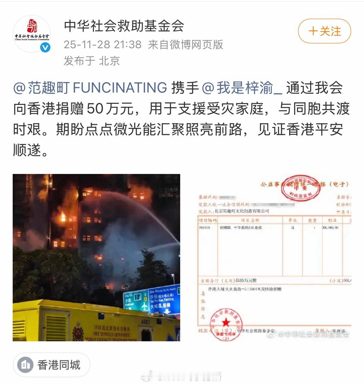 梓渝通过中华社会救助基金会捐赠50万人民币支援香港火灾