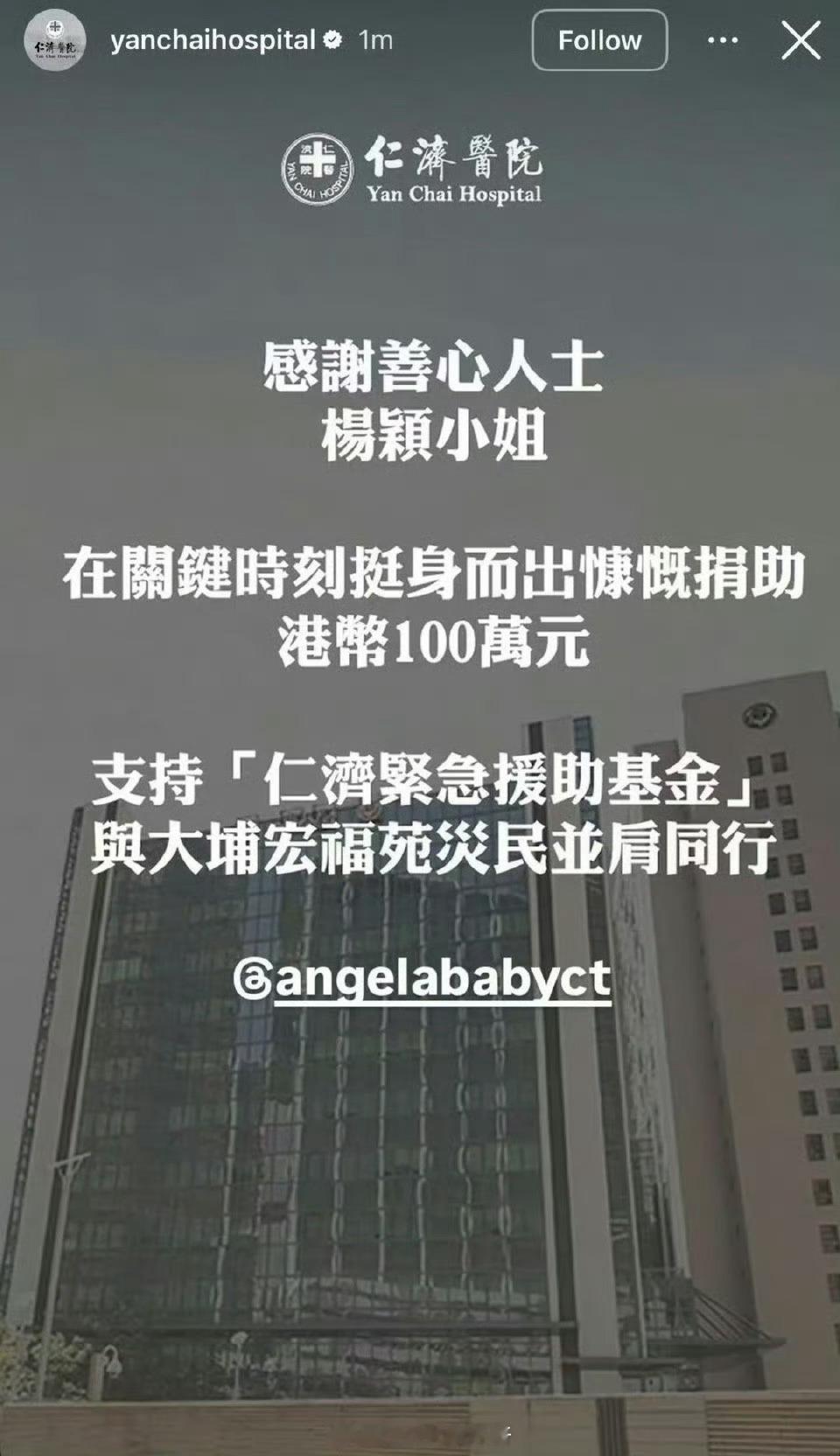 Angelababy捐赠香港100万元,应该是直接通过香港那边捐的,发出来才知道原来捐了,人美心善啊
