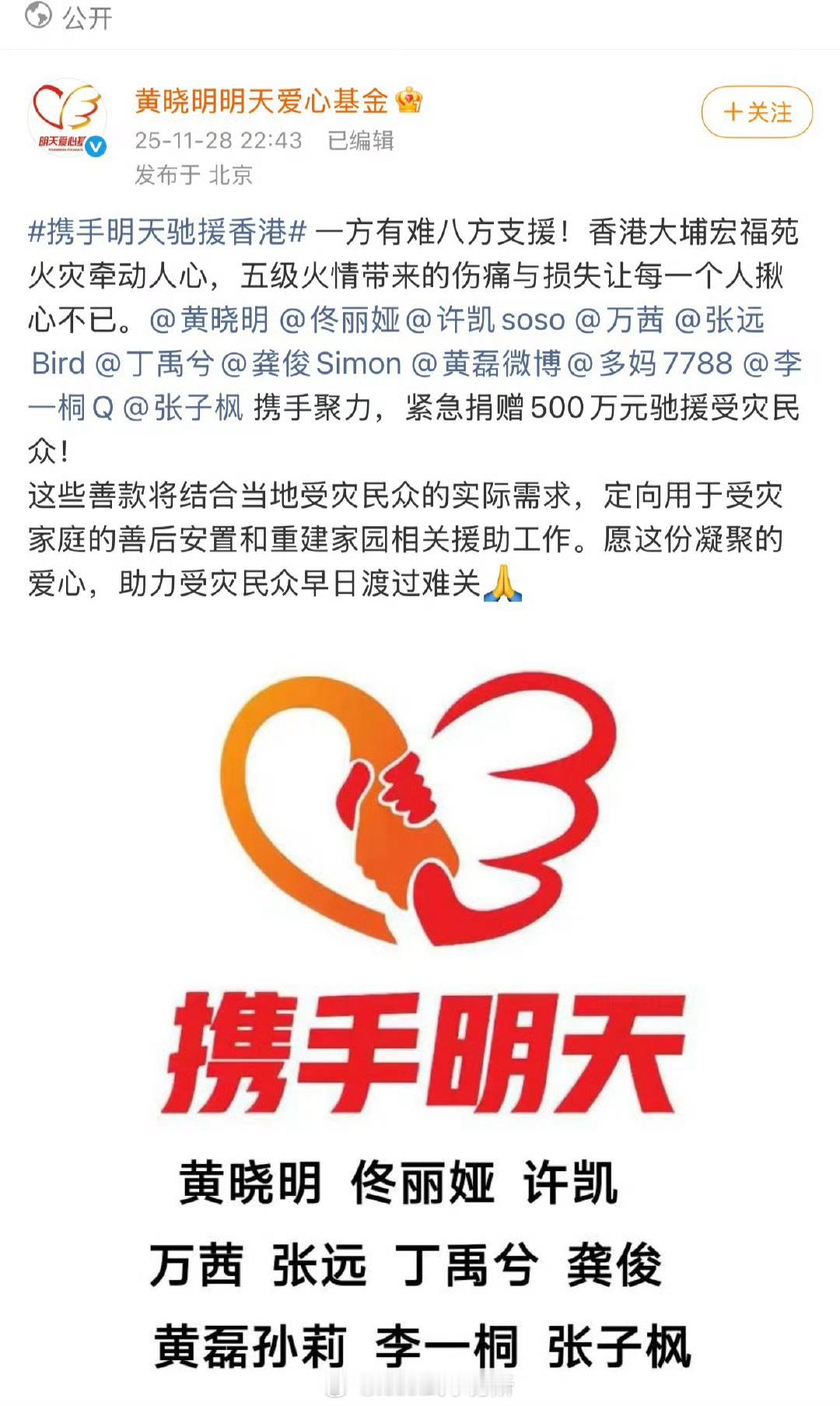 梓渝通过中华社会救助基金会捐赠50万人民币支援香港火灾