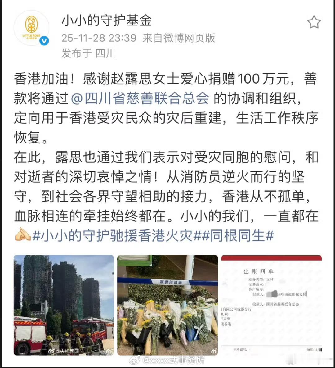 梓渝通过中华社会救助基金会捐赠50万人民币支援香港火灾