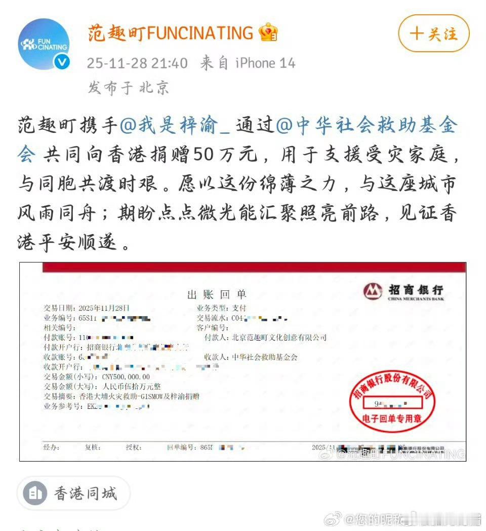 梓渝向香港捐款50万元从个人两次捐赠累计100万元驰援香港灾区,到粉丝凝聚爱心筹集50万元善款,梓渝与粉丝群体用实际行动诠释“公益路上不分你我”。这份跨越个体与群体的善意,是艺人正能量的传递,更是粉丝群体爱心的呼应,每一笔捐款都承载着对香港同胞的深切关怀,愿这份暖意助力灾区重建,盼同胞皆安!
