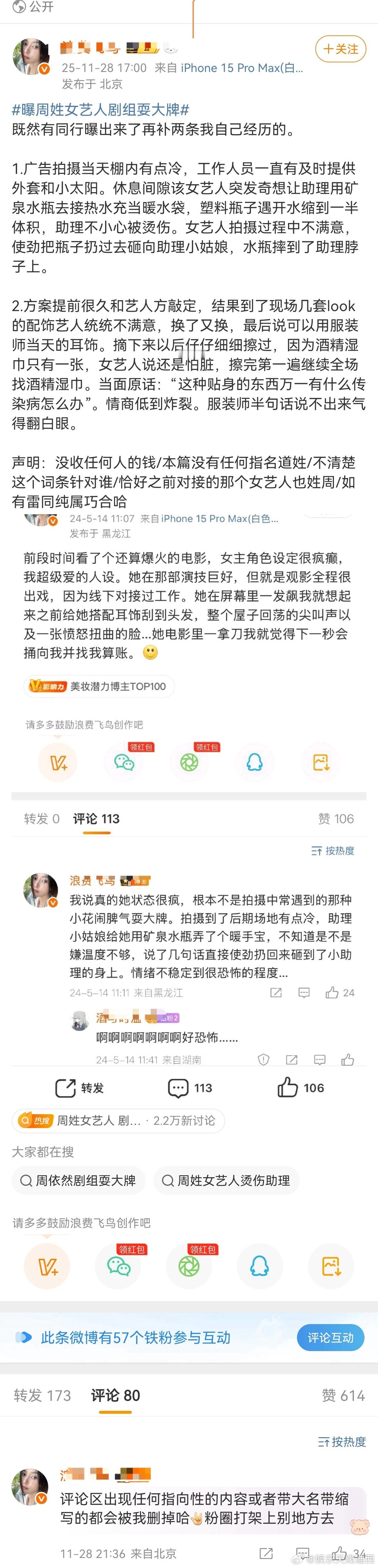 周依然词条下看到的。就用装了开水的塑料瓶砸助理这一点,代入打工人视角真的会很窒息不把人当人周依然周姓女艺人 剧组耍大牌