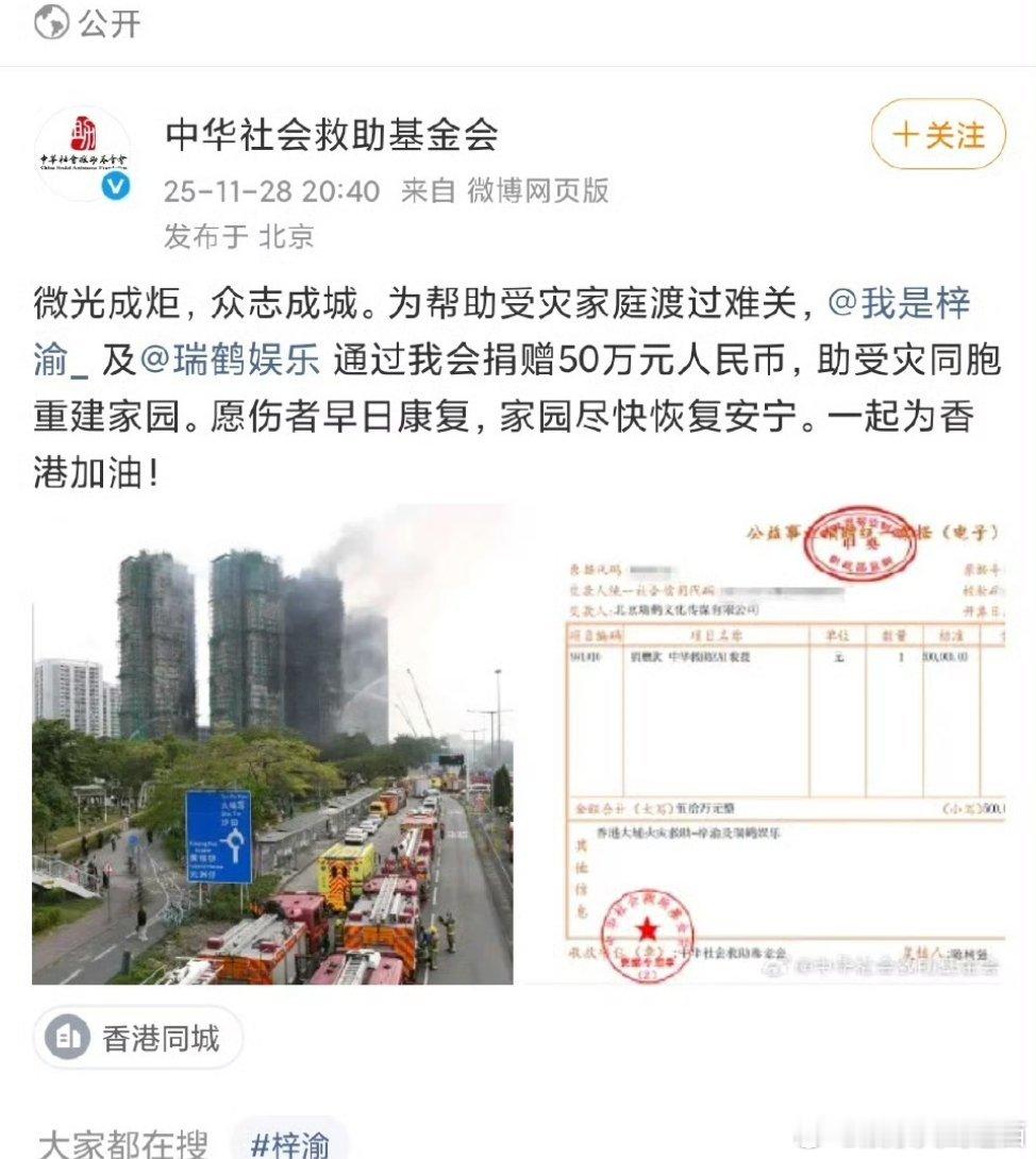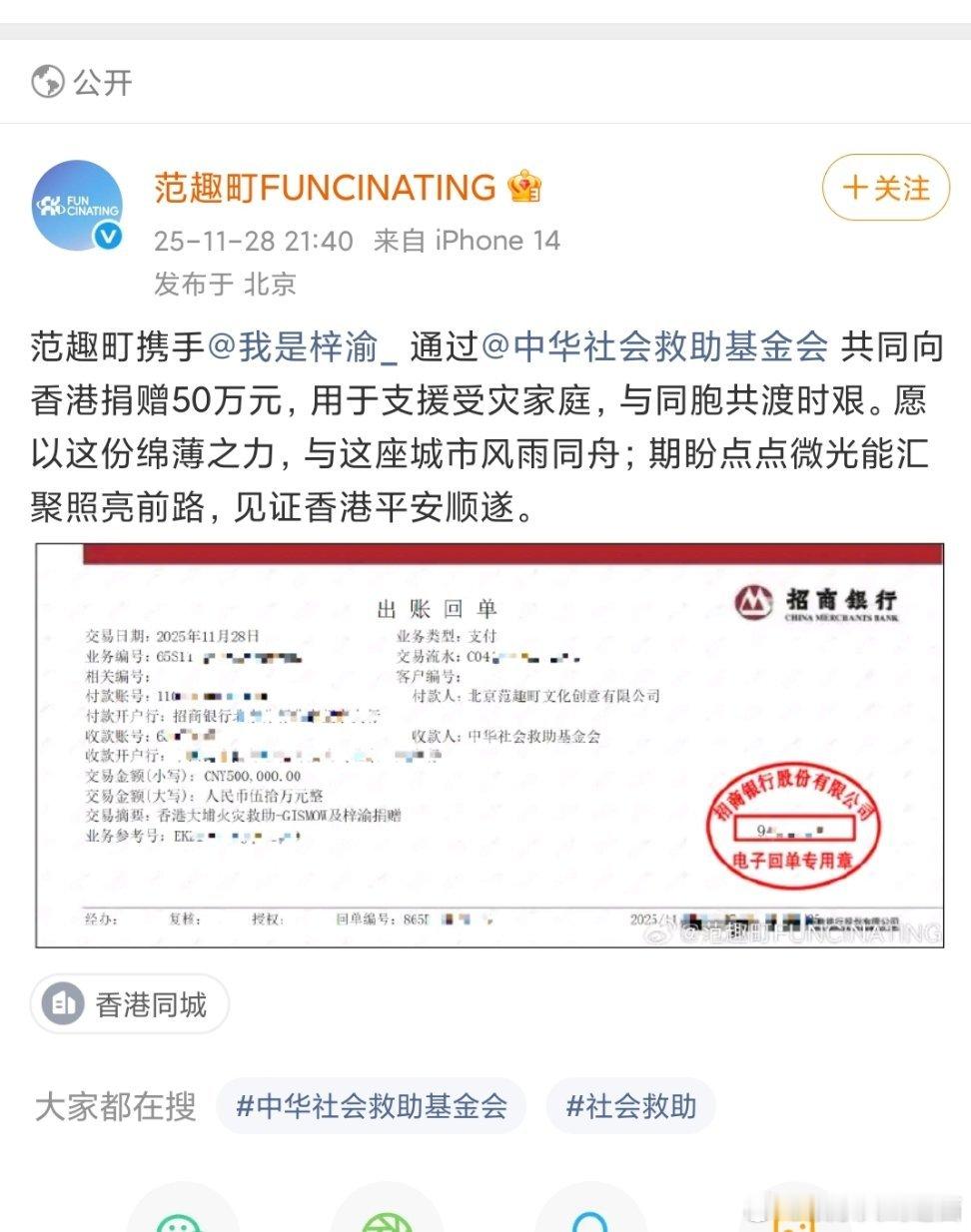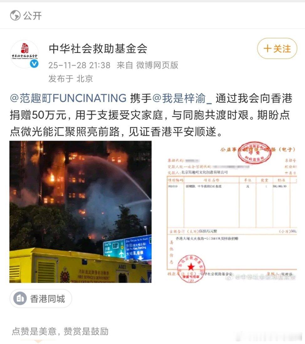 梓渝向香港捐款50万元 范趣町携手梓渝捐款50万元继梓渝捐款50万元后,范趣町也携手梓渝,通过中华社会救助基金会向香港捐款50万元;梓渝官方粉丝团也发起驰援香港捐款,粉丝捐款超过50万元!好温暖的群体,梓渝带动粉丝和企业一起驰援香港,微光成炬,众志成城🙏🏻 梓渝